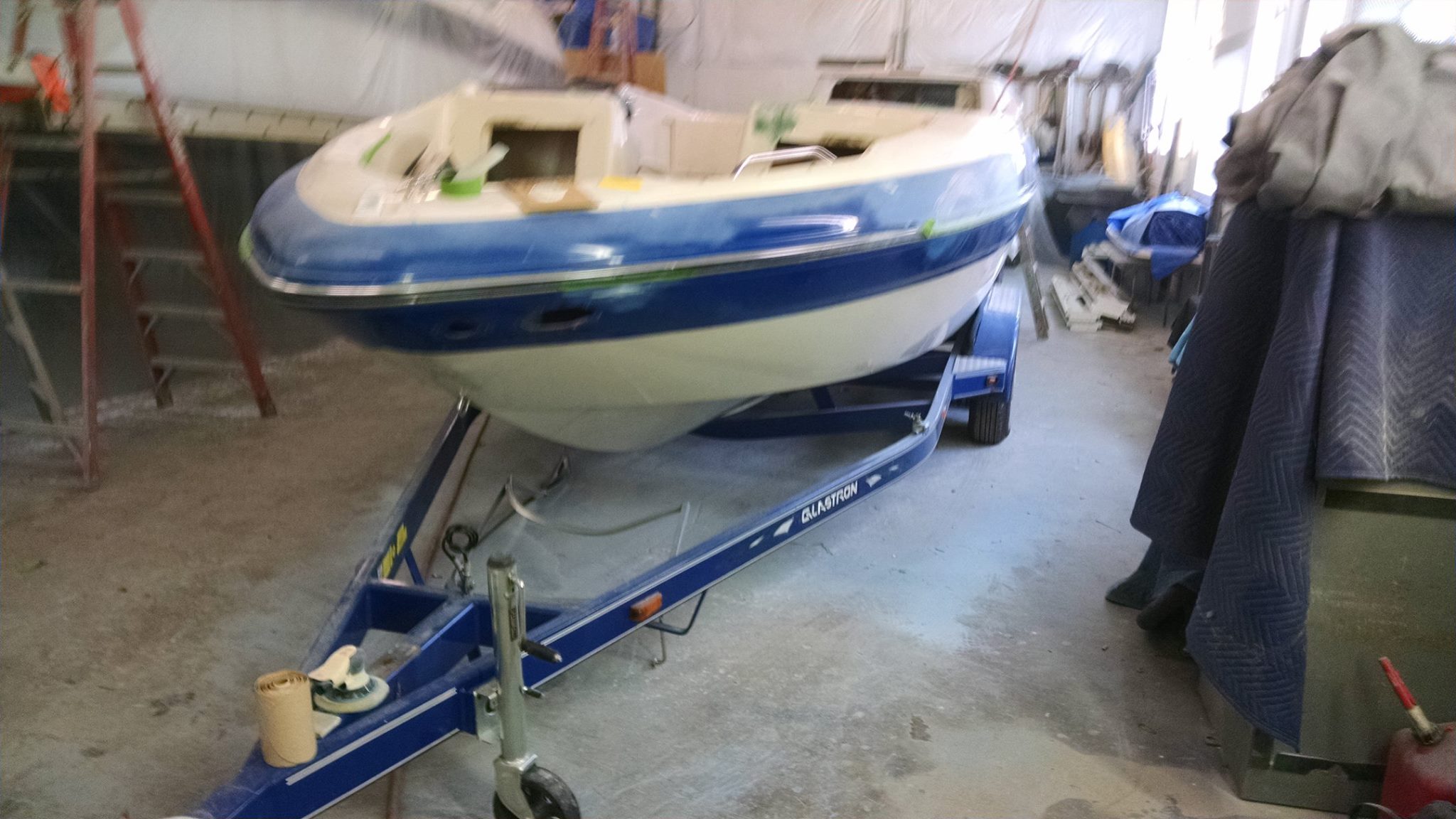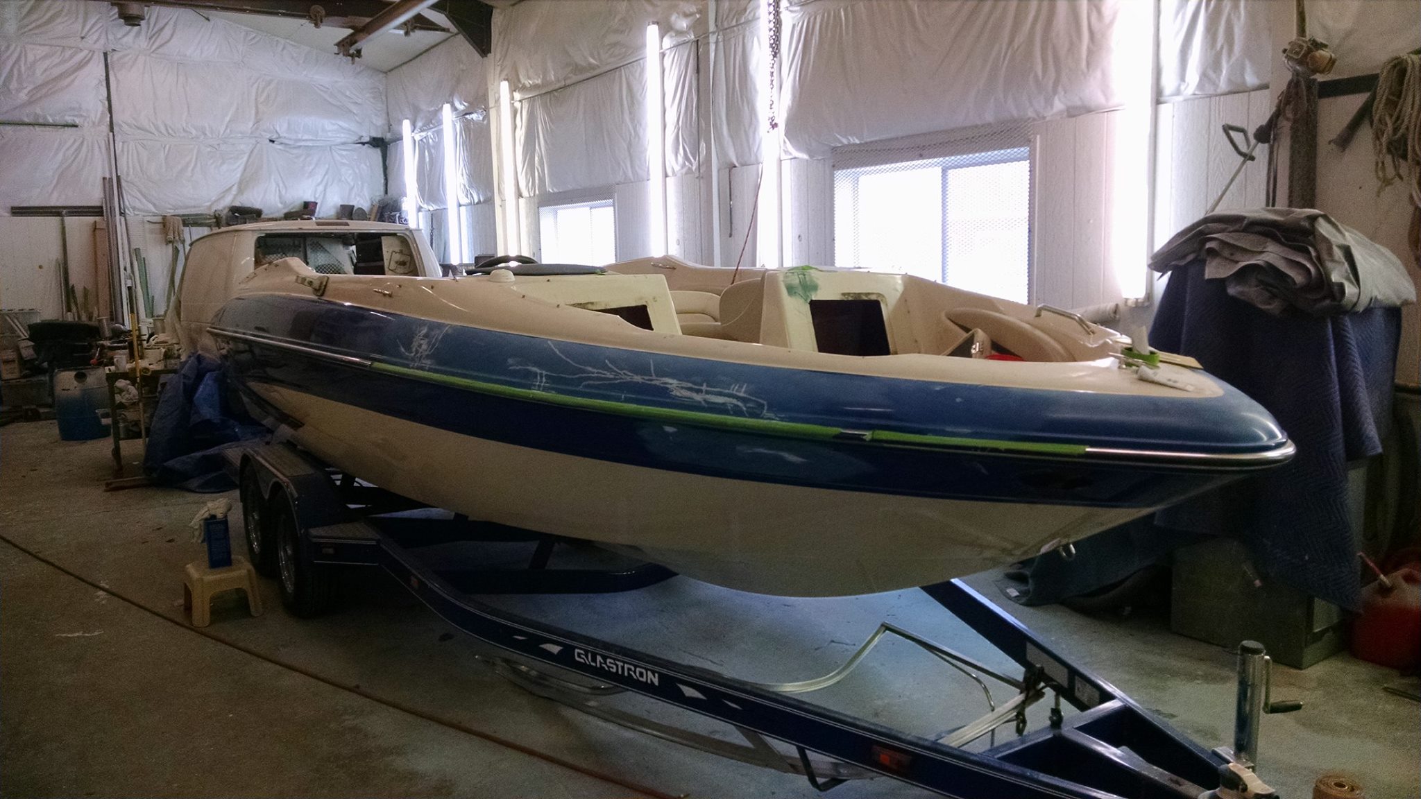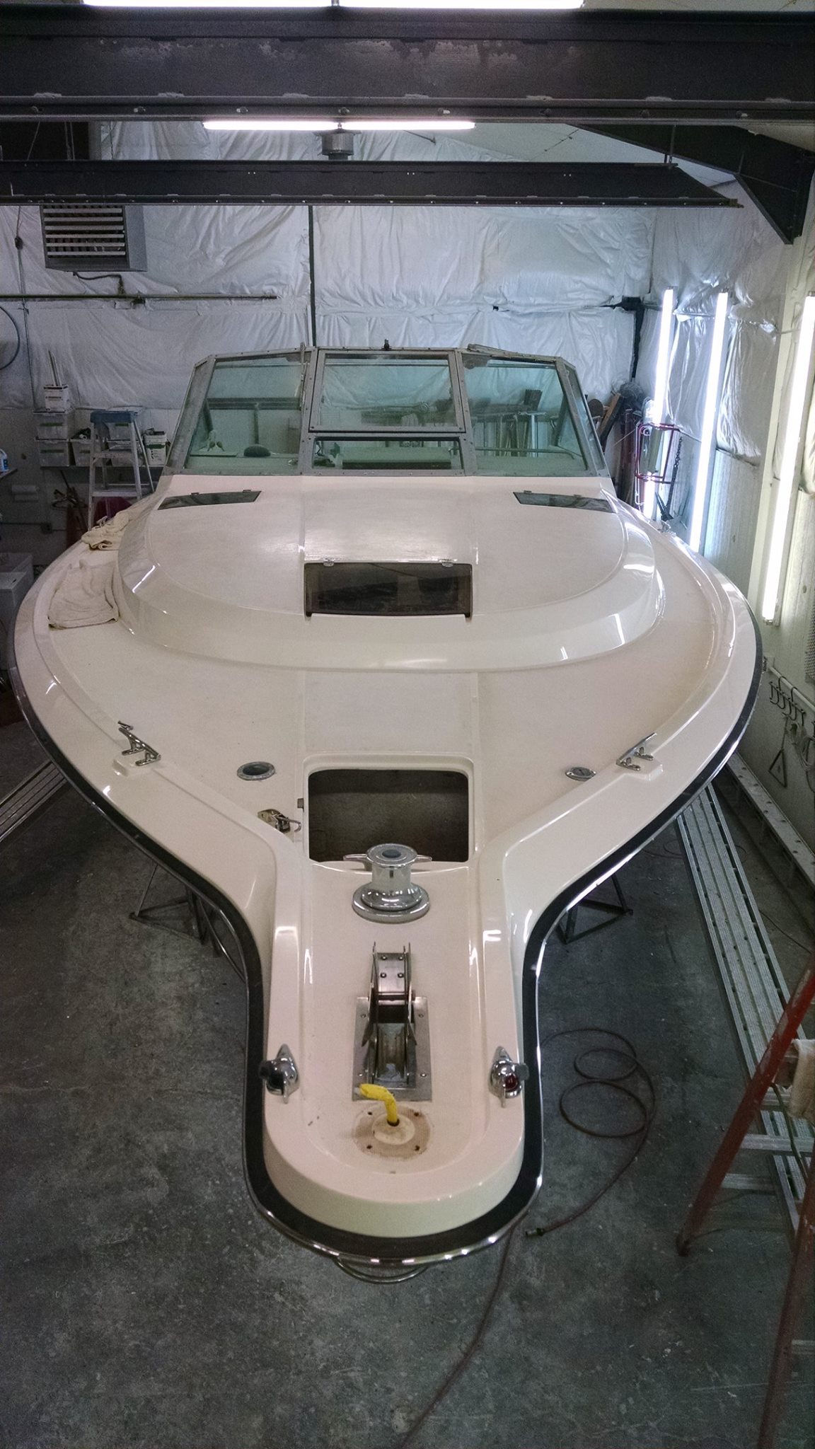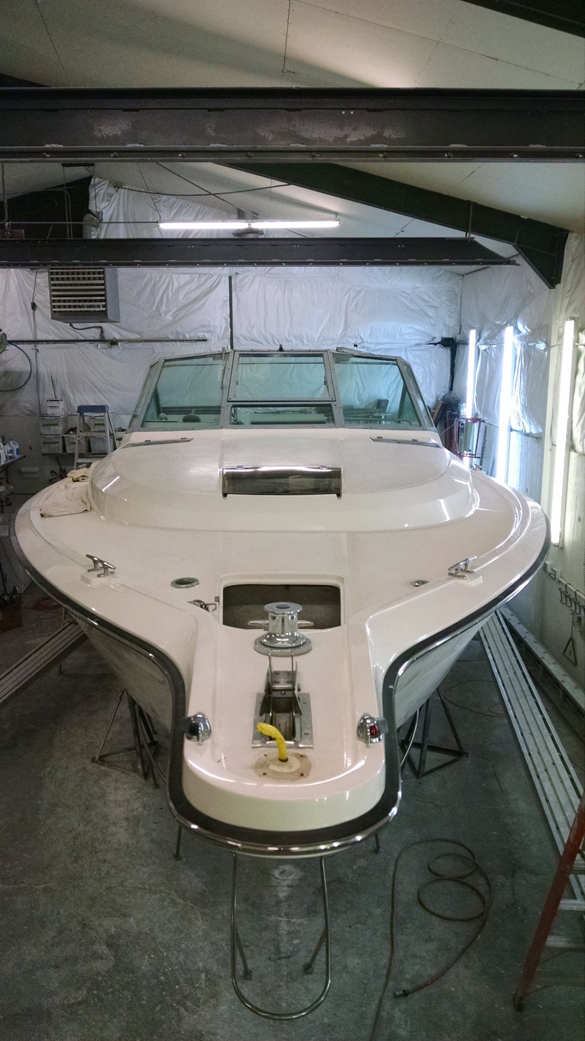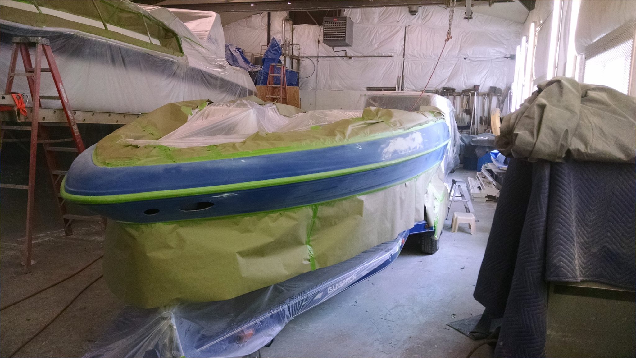 Heavy snow fall at Lake Chautauqua, New York, brought shed roof down on ski arch and windshield. Re-gel-coated top half, added new graphics. Replaced with new windshield and brackets.