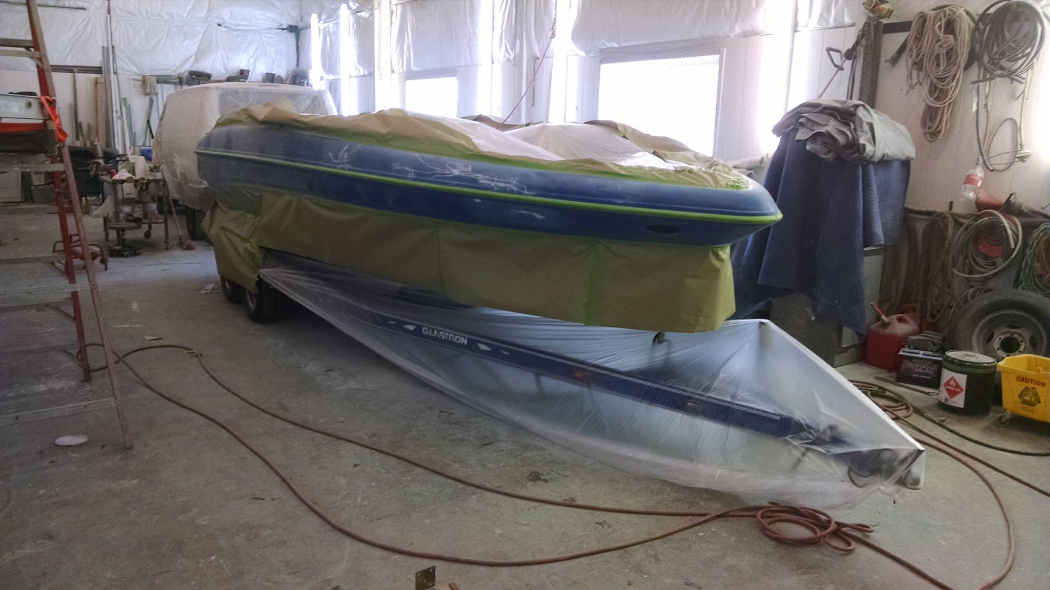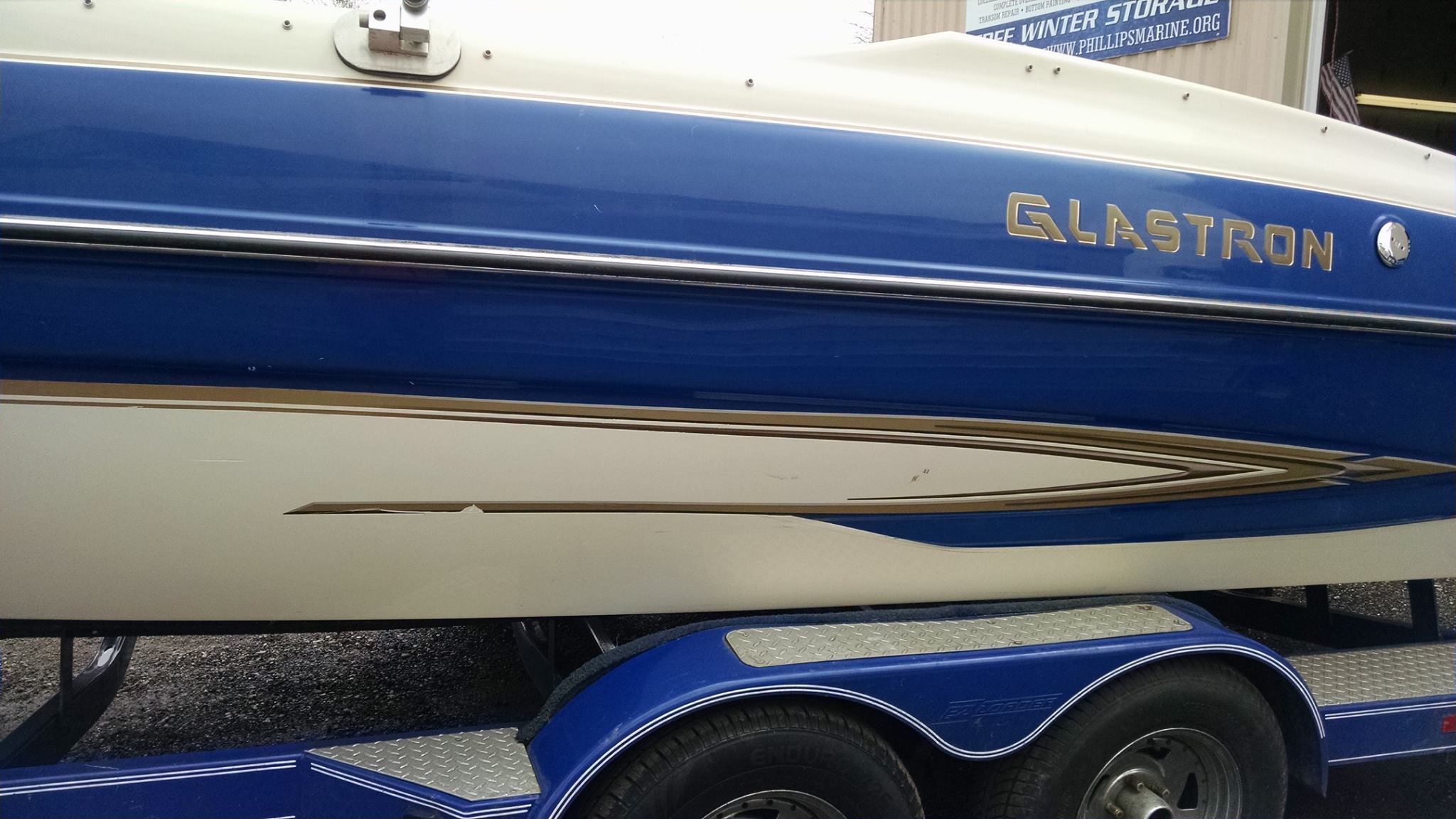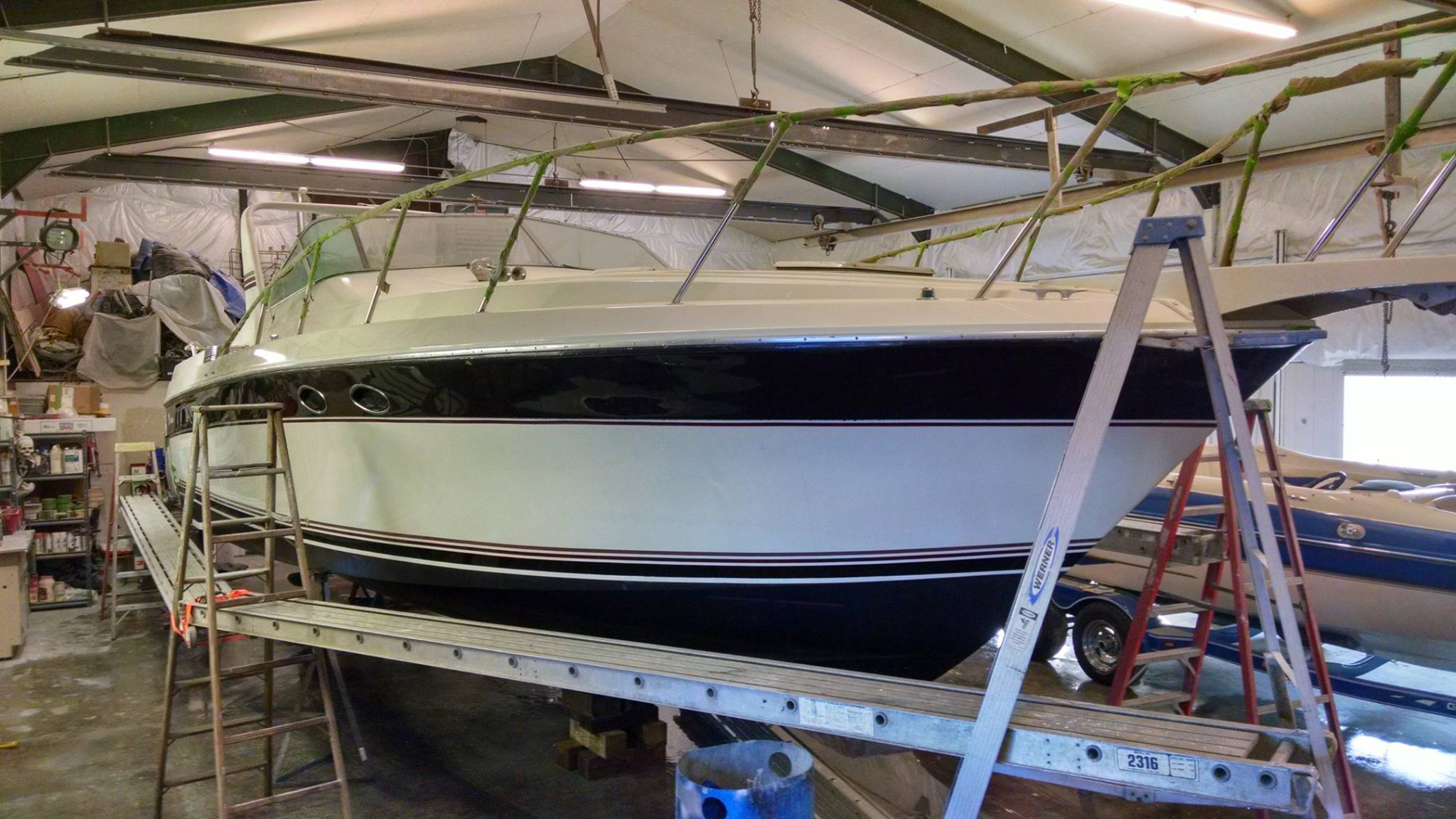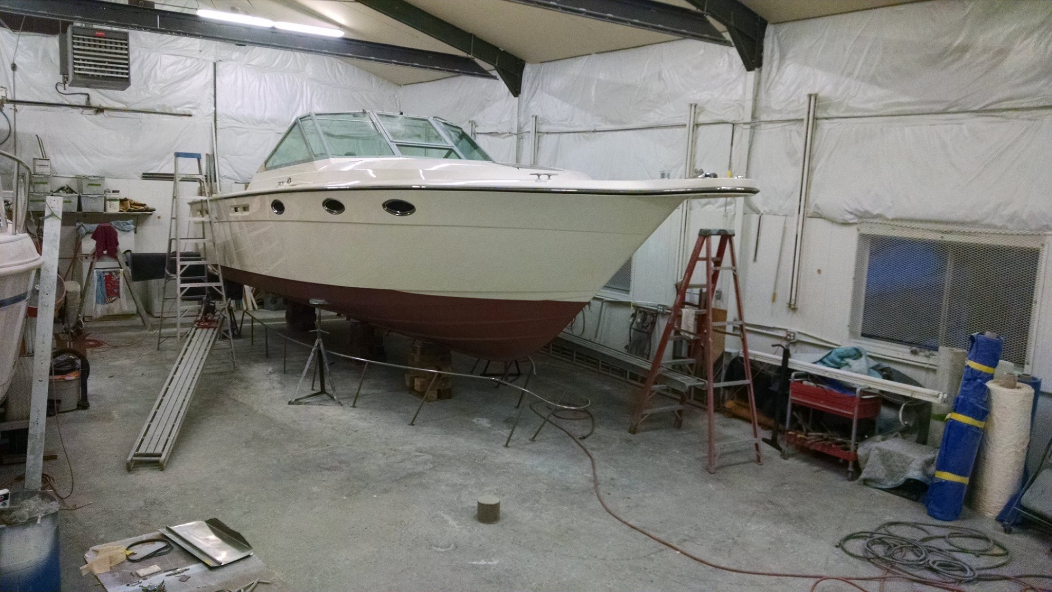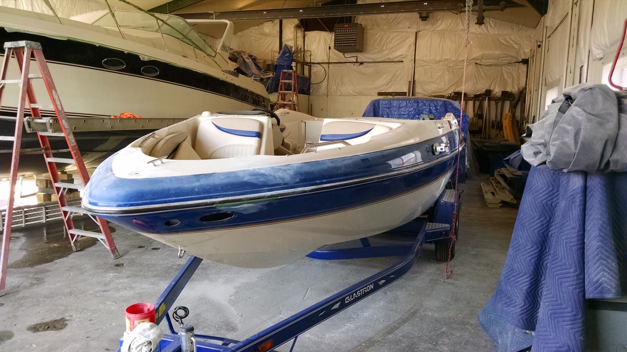 Heavy snow fall at Lake Chautauqua, New York, brought shed roof down on ski arch and windshield. Re-gel-coated top half, added new graphics. Replaced with new windshield and brackets.