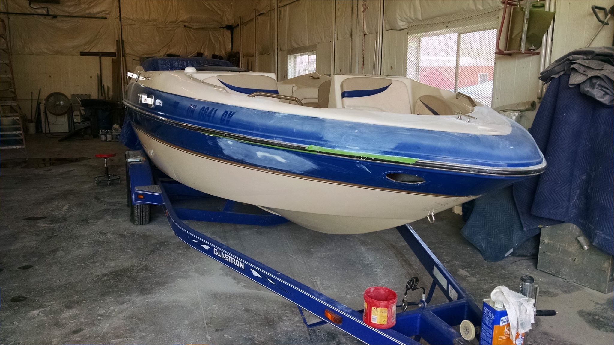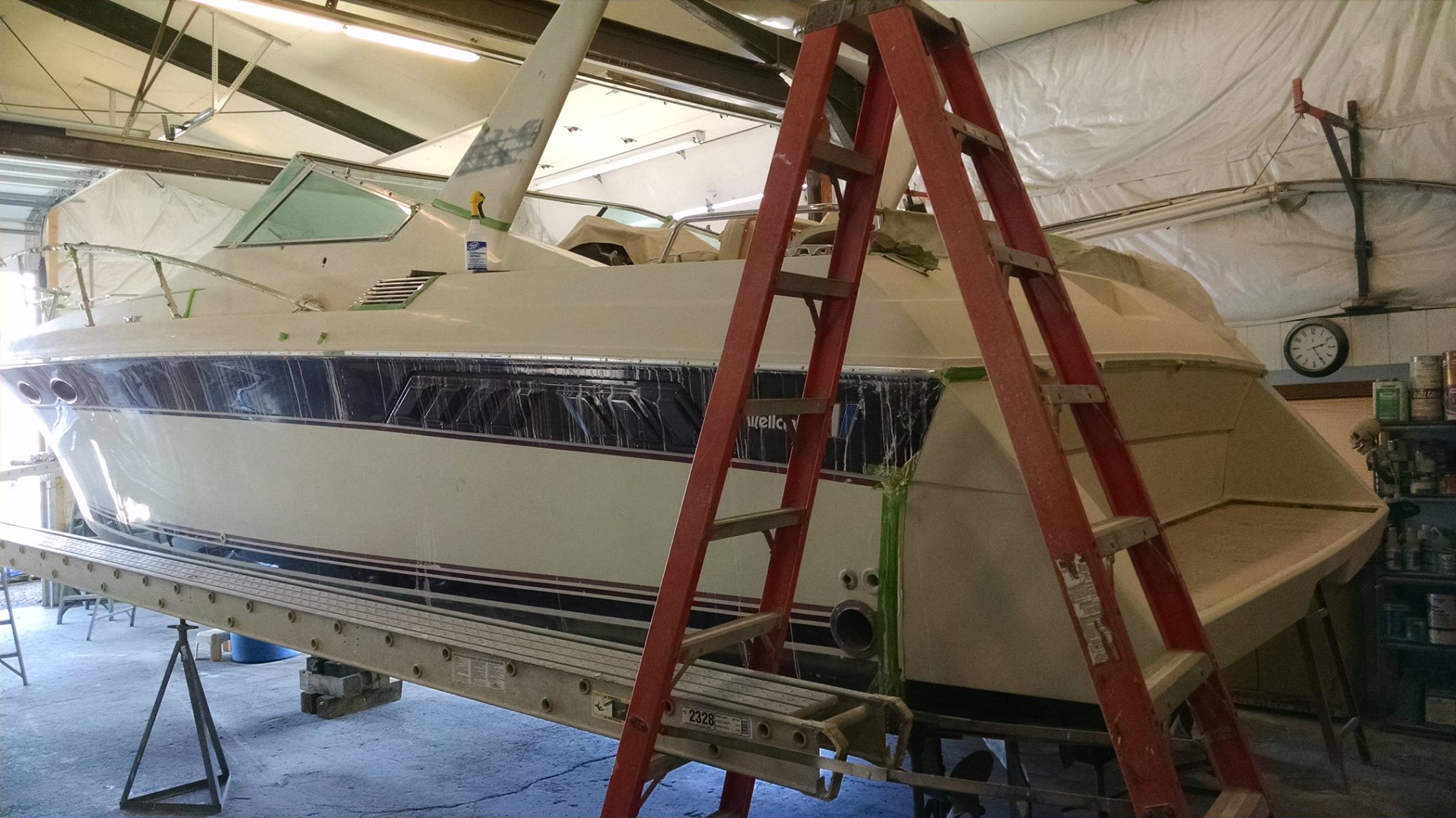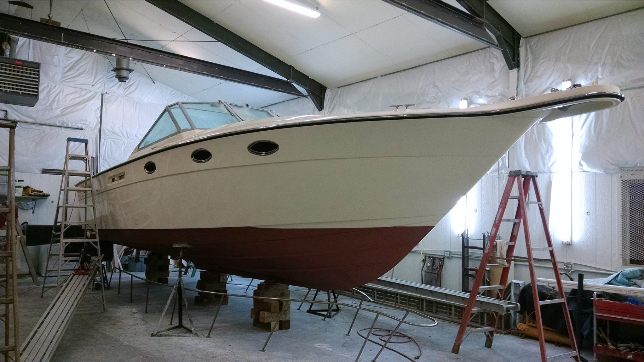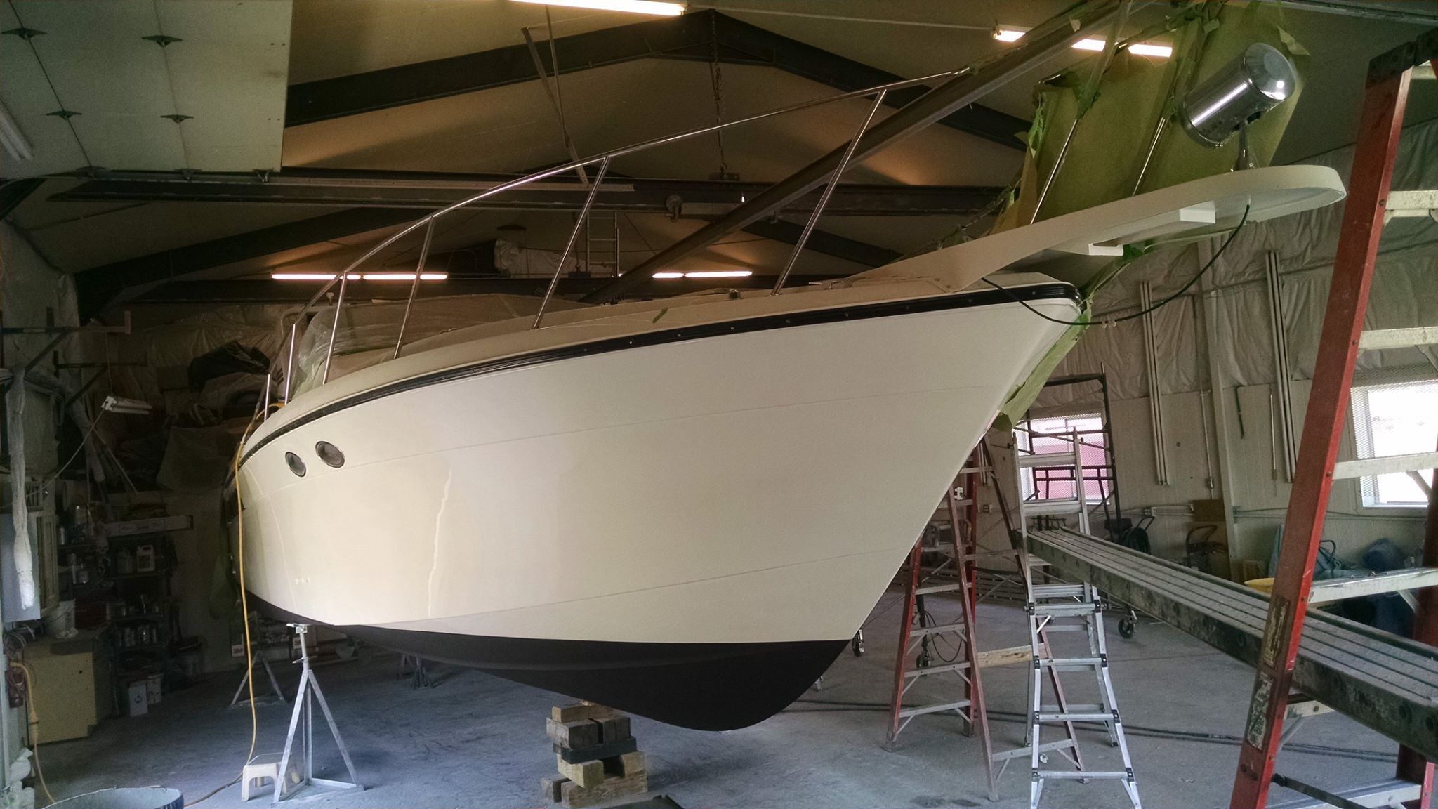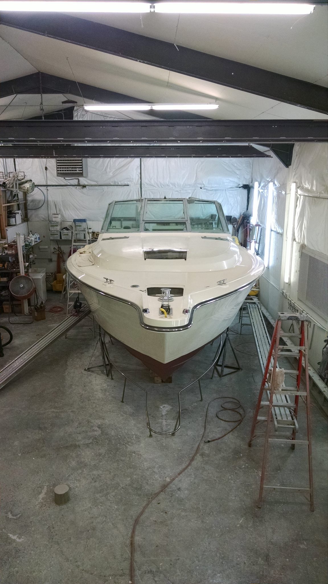 Heavy snow fall at Lake Chautauqua, New York, brought shed roof down on ski arch and windshield. Re-gel-coated top half, added new graphics. Replaced with new windshield and brackets.