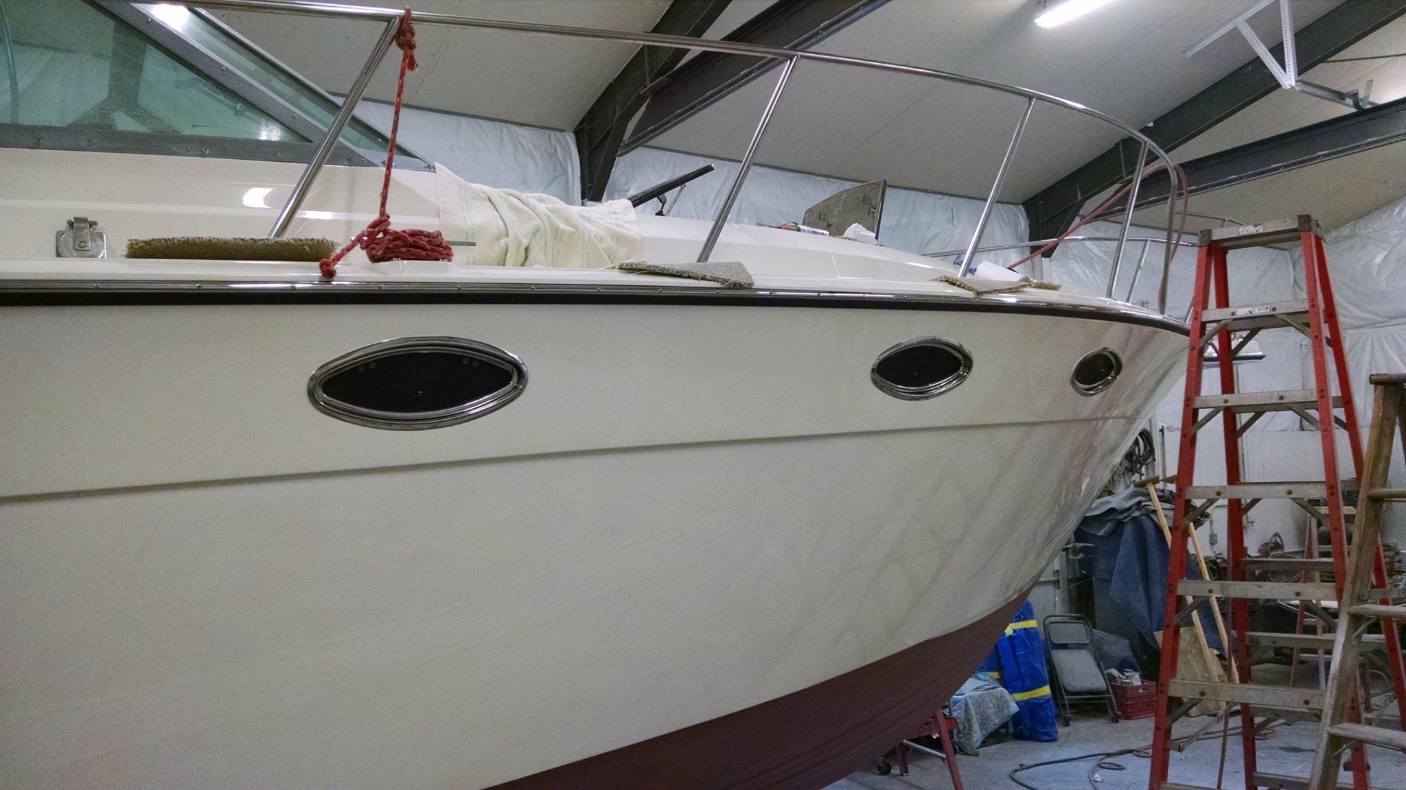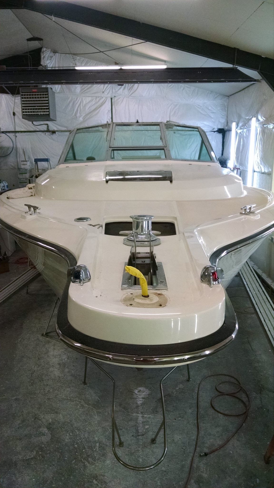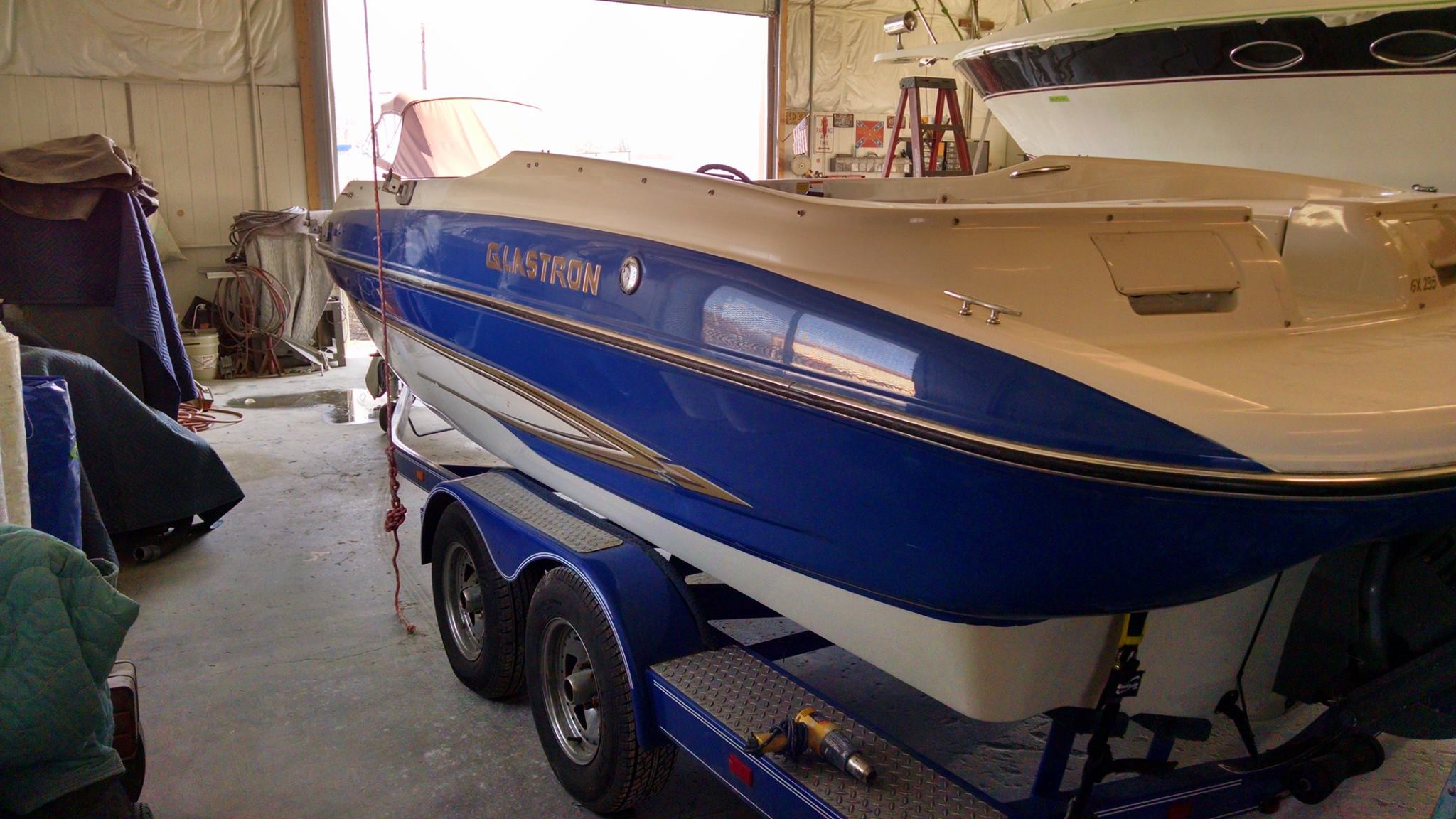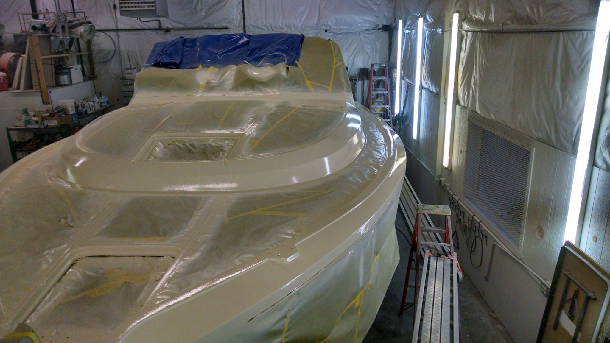 Heavy snow fall at Lake Chautauqua, New York, brought shed roof down on ski arch and windshield. Re-gel-coated top half, added new graphics. Replaced with new windshield and brackets.