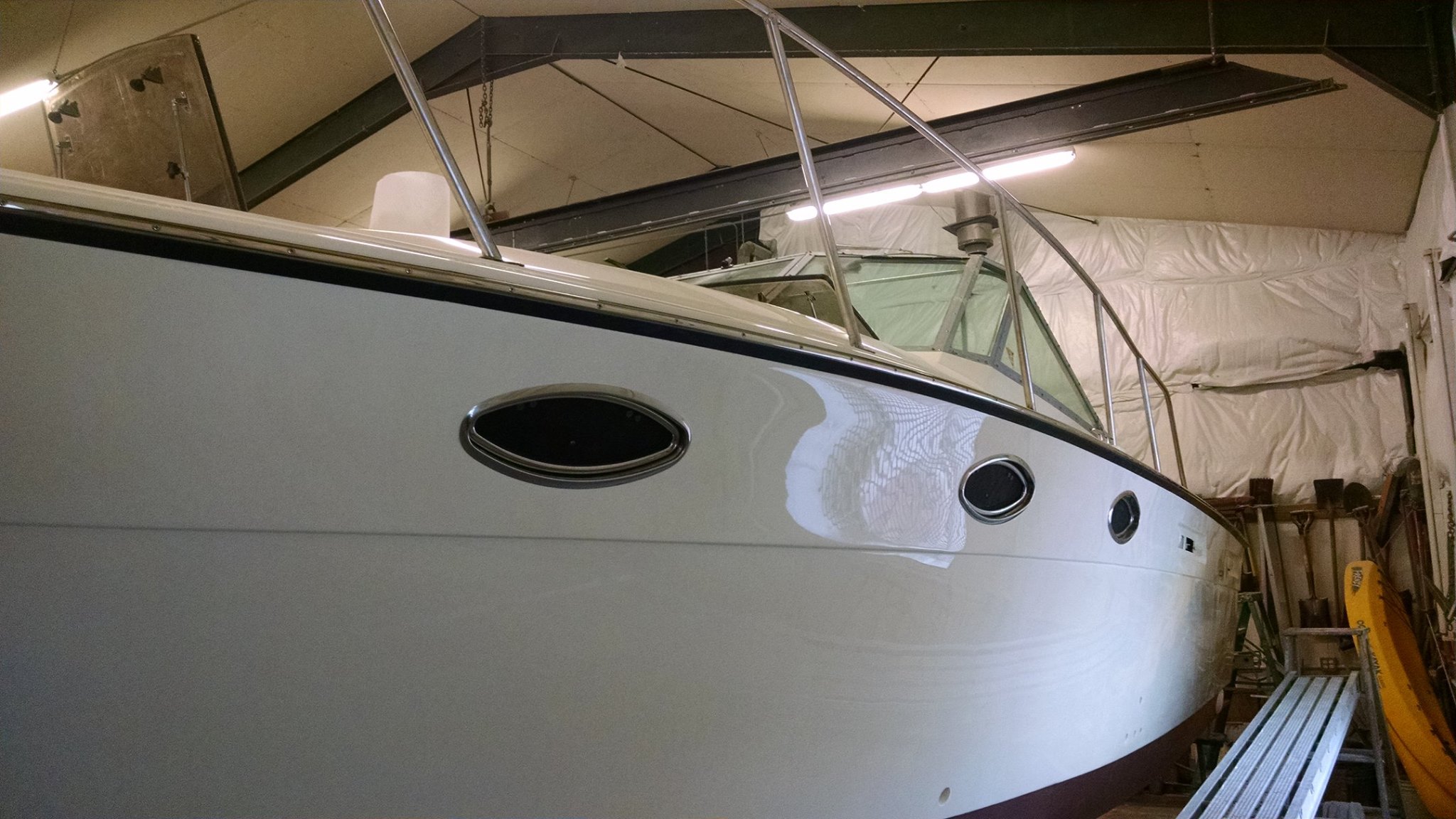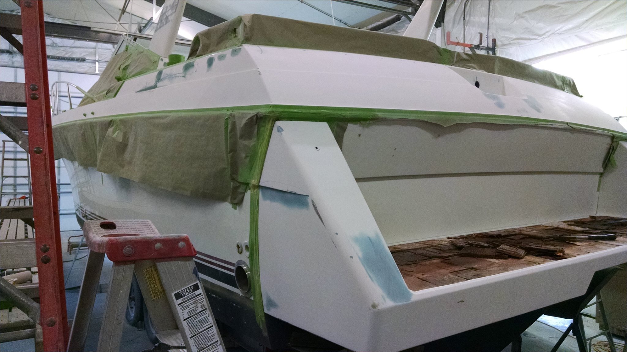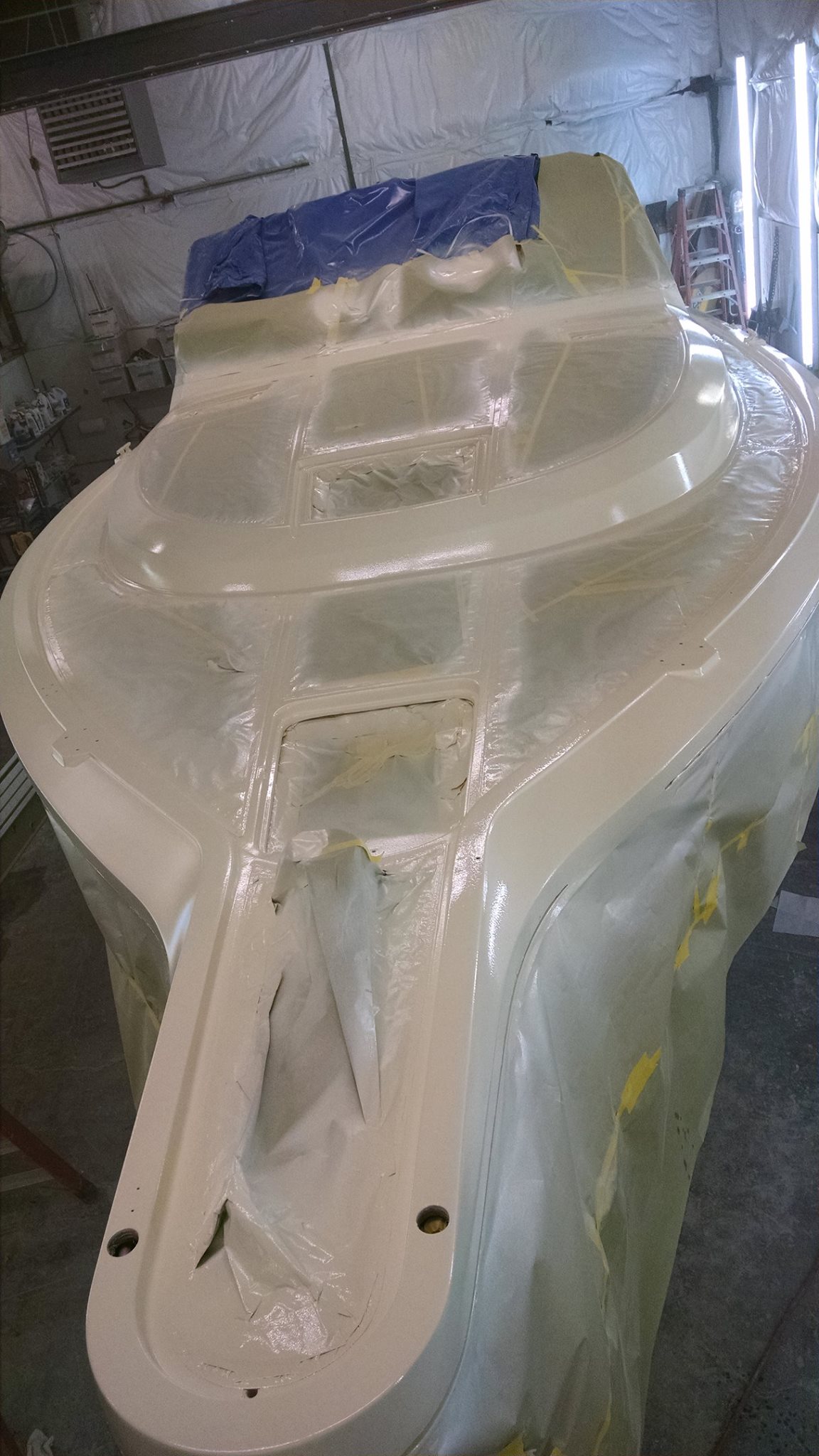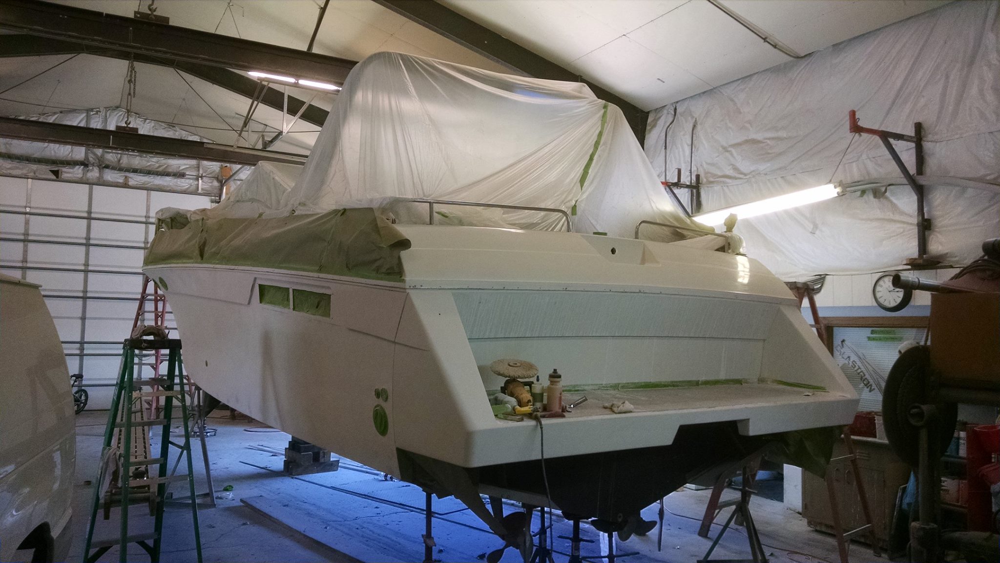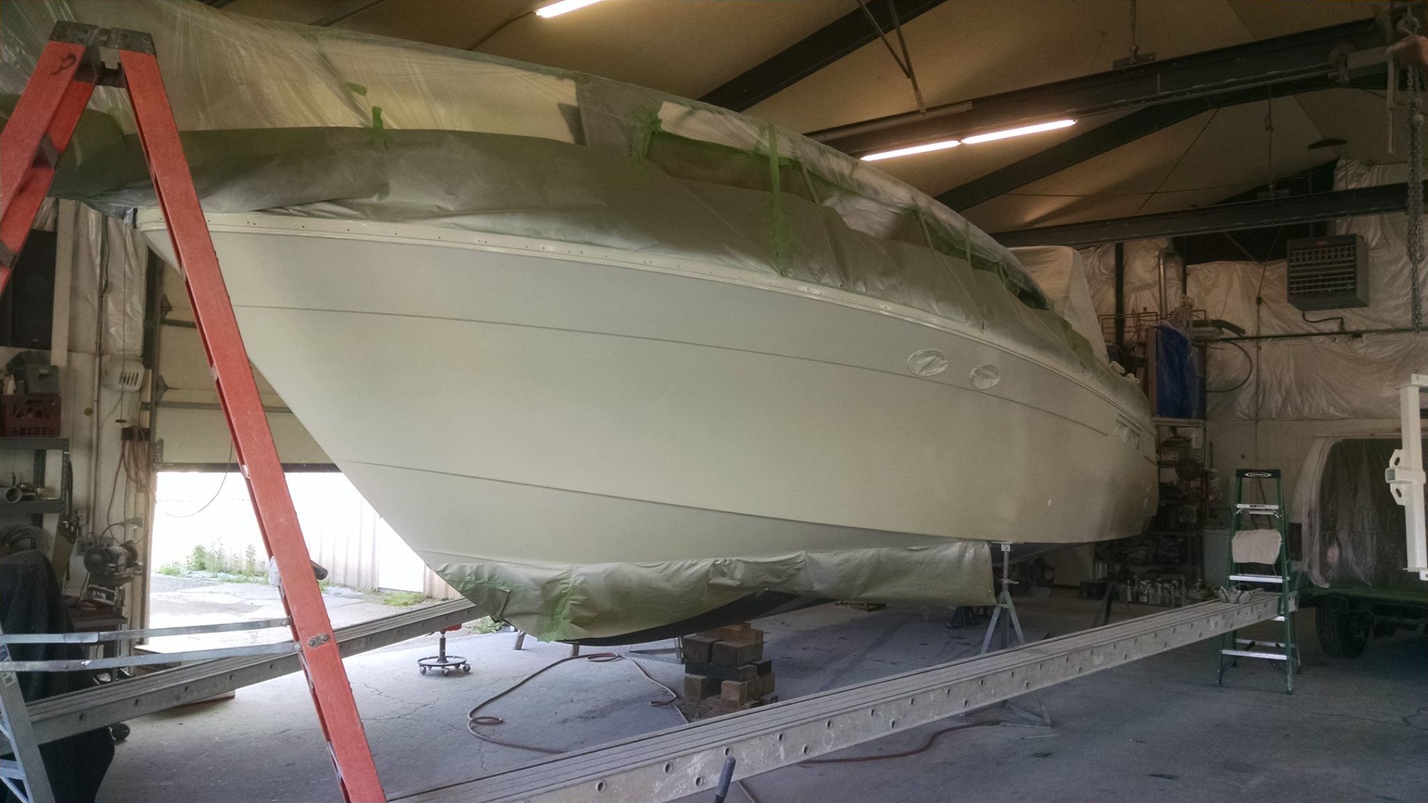 Heavy snow fall at Lake Chautauqua, New York, brought shed roof down on ski arch and windshield. Re-gel-coated top half, added new graphics. Replaced with new windshield and brackets.