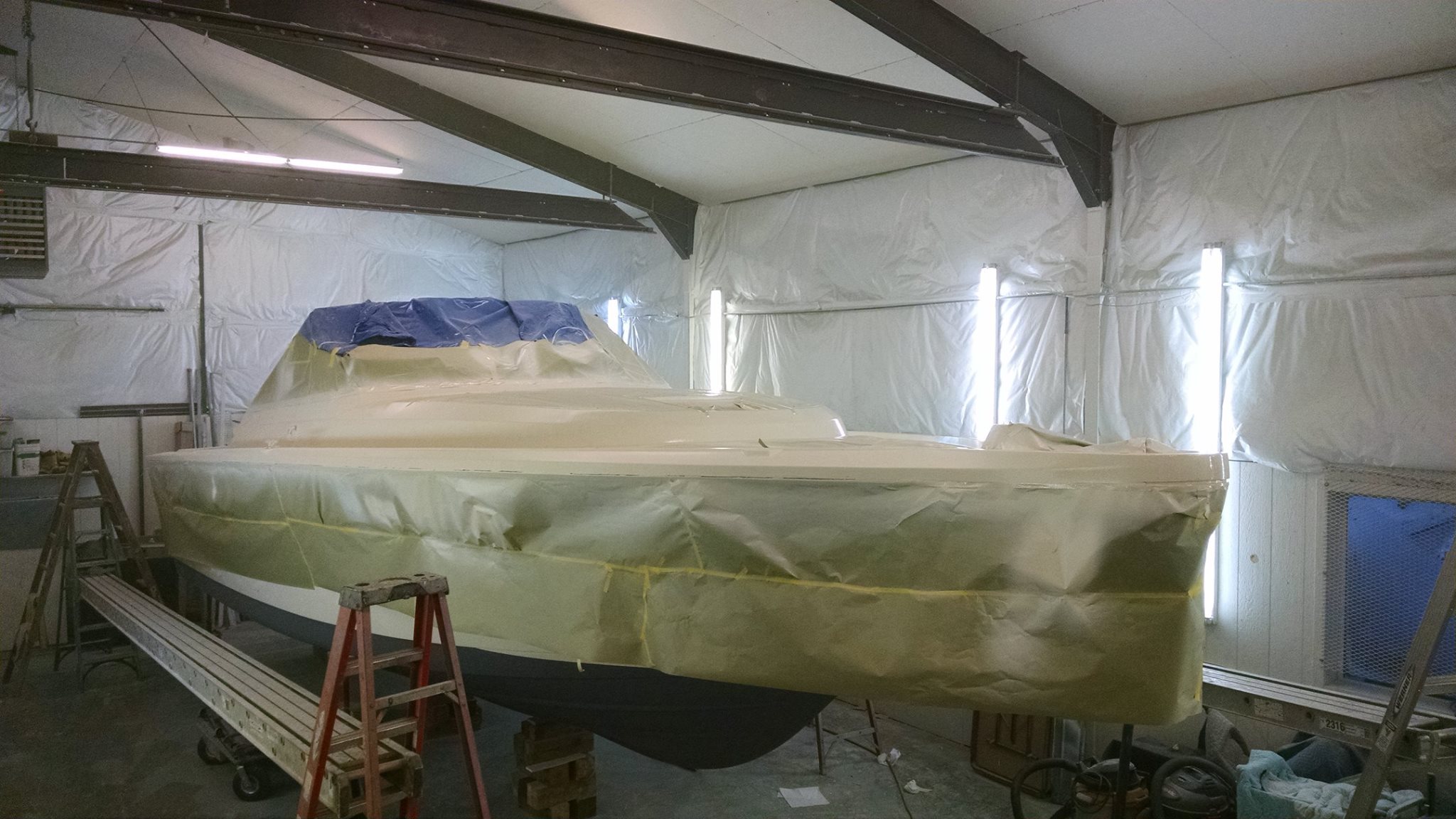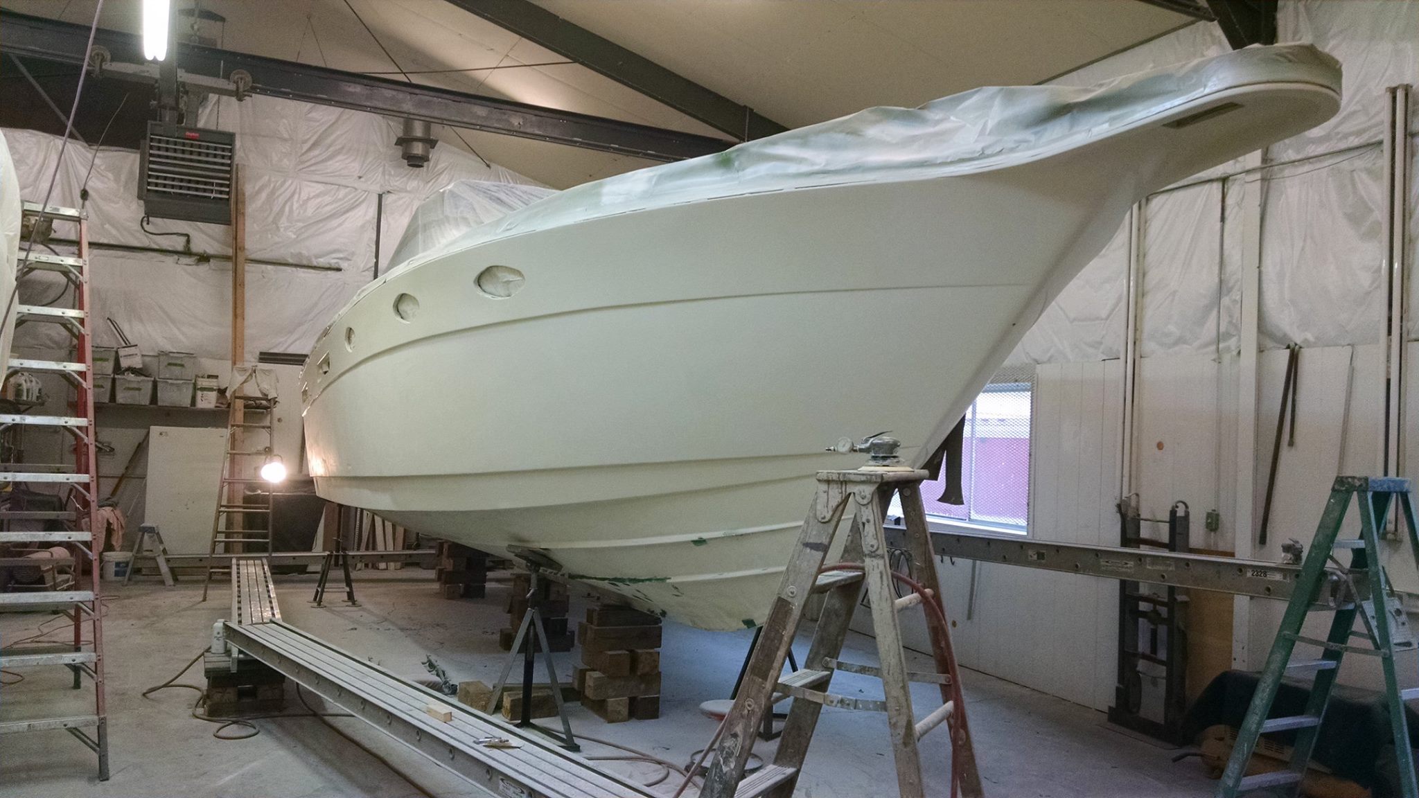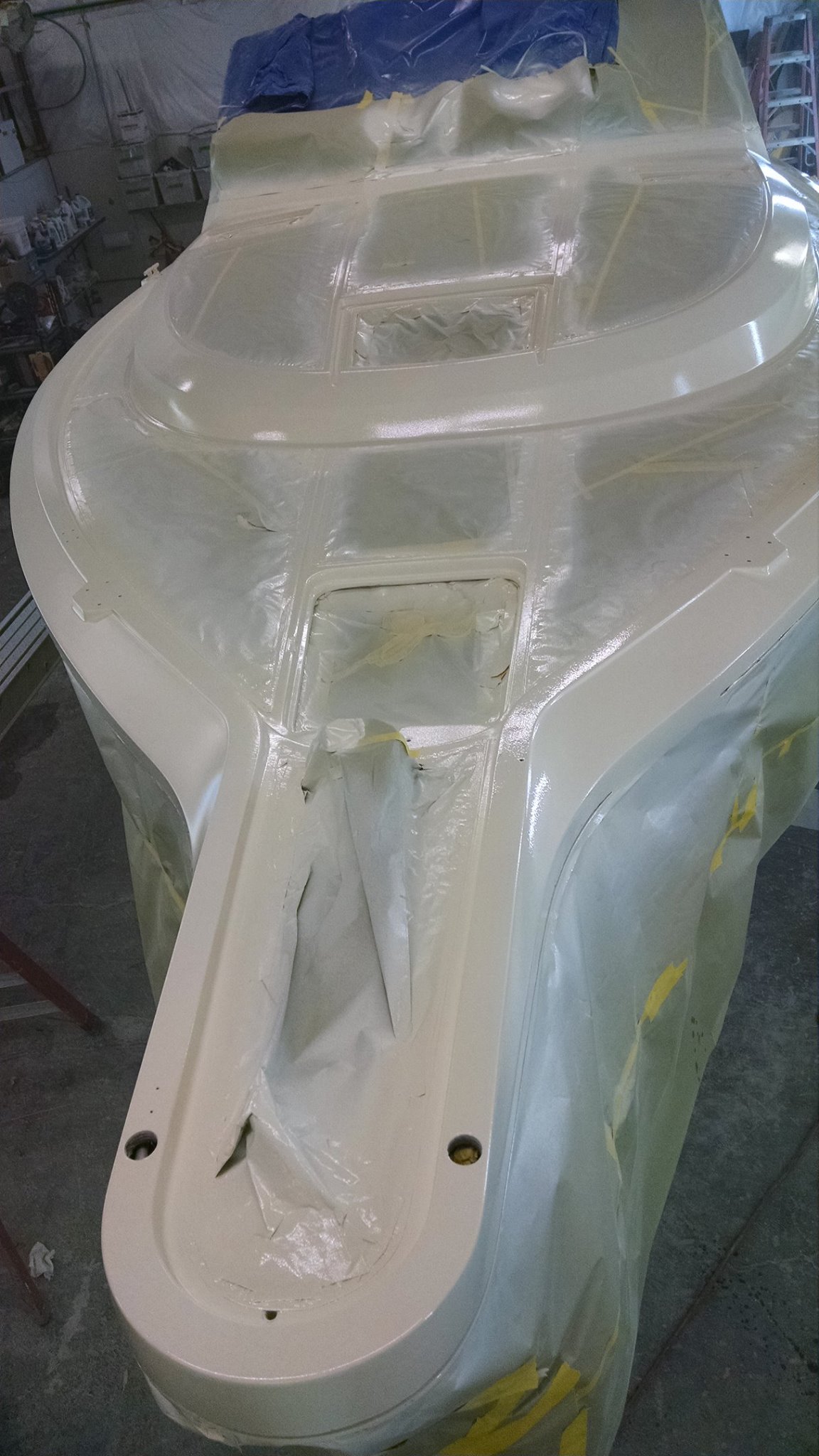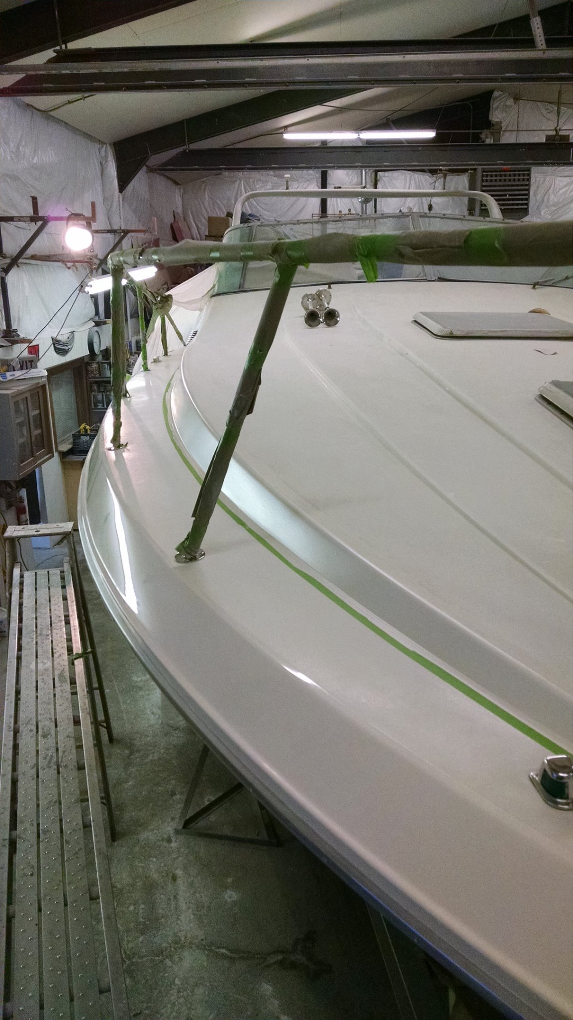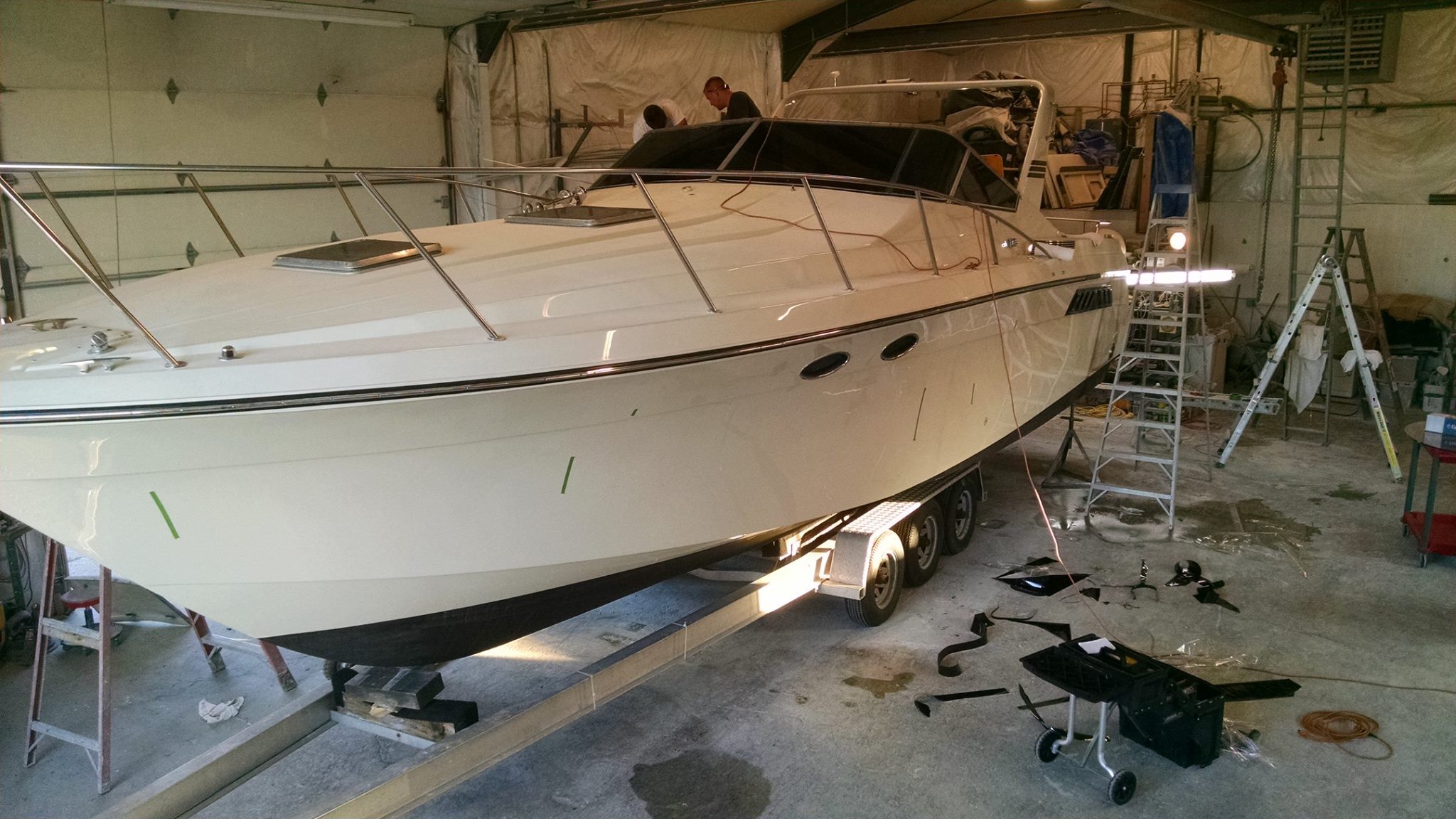 Heavy snow fall at Lake Chautauqua, New York, brought shed roof down on ski arch and windshield. Re-gel-coated top half, added new graphics. Replaced with new windshield and brackets.