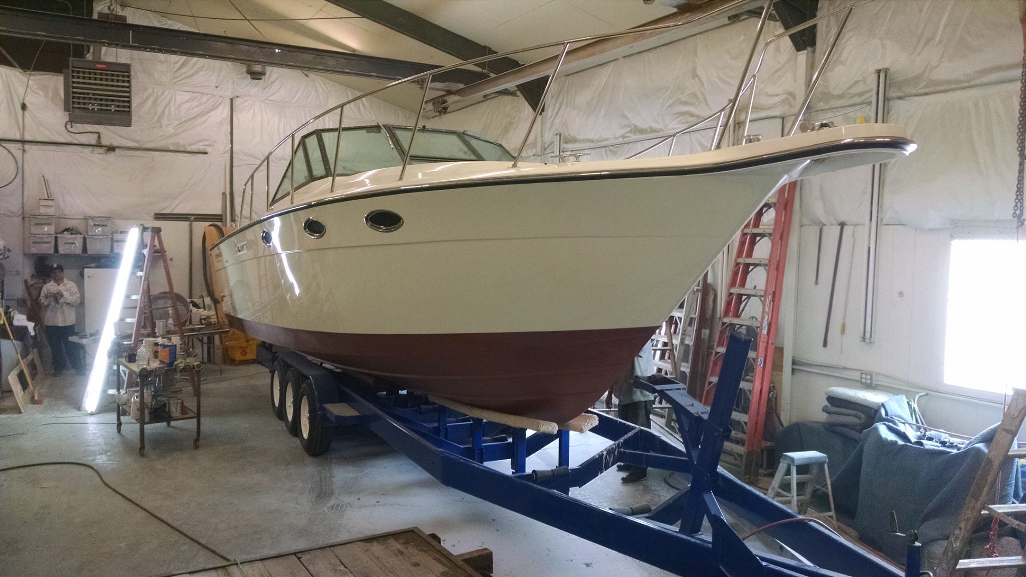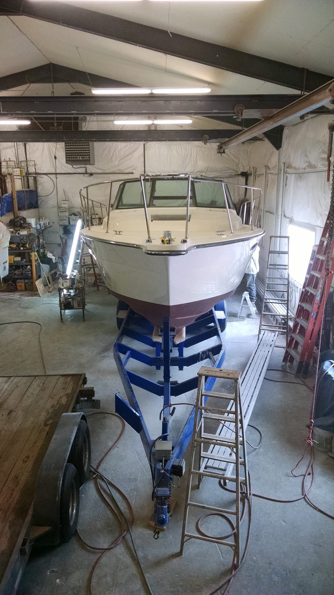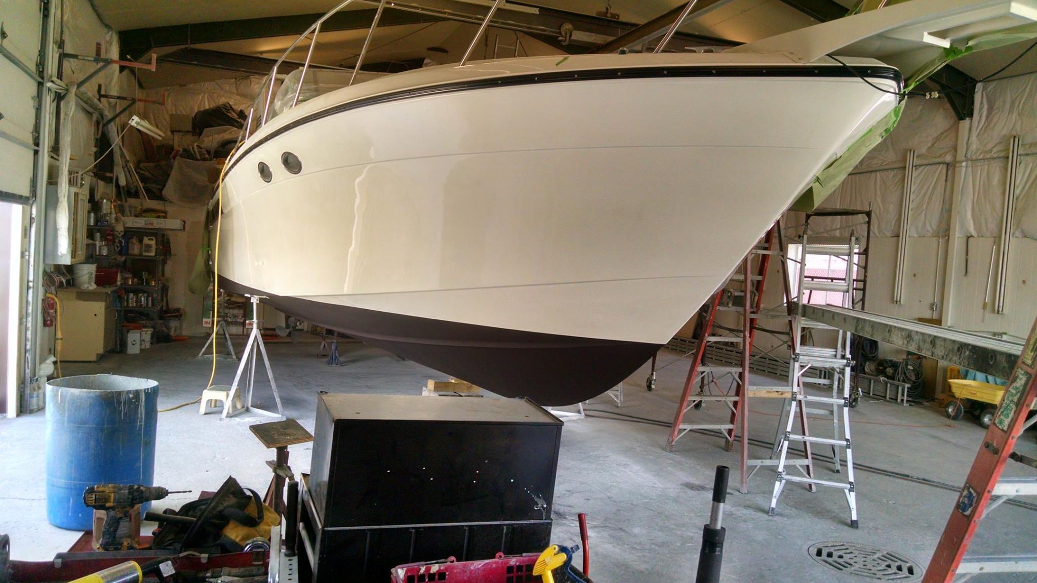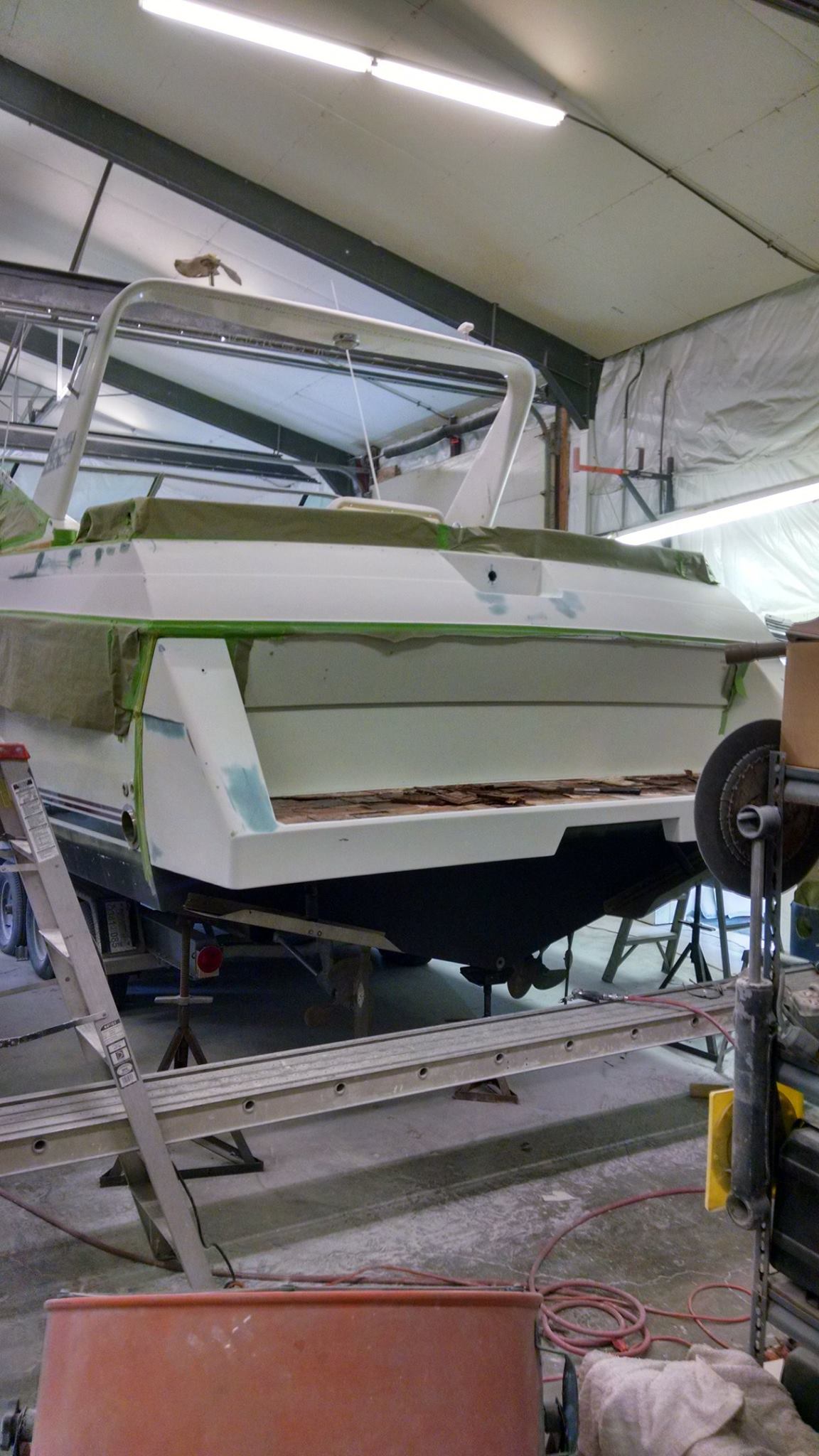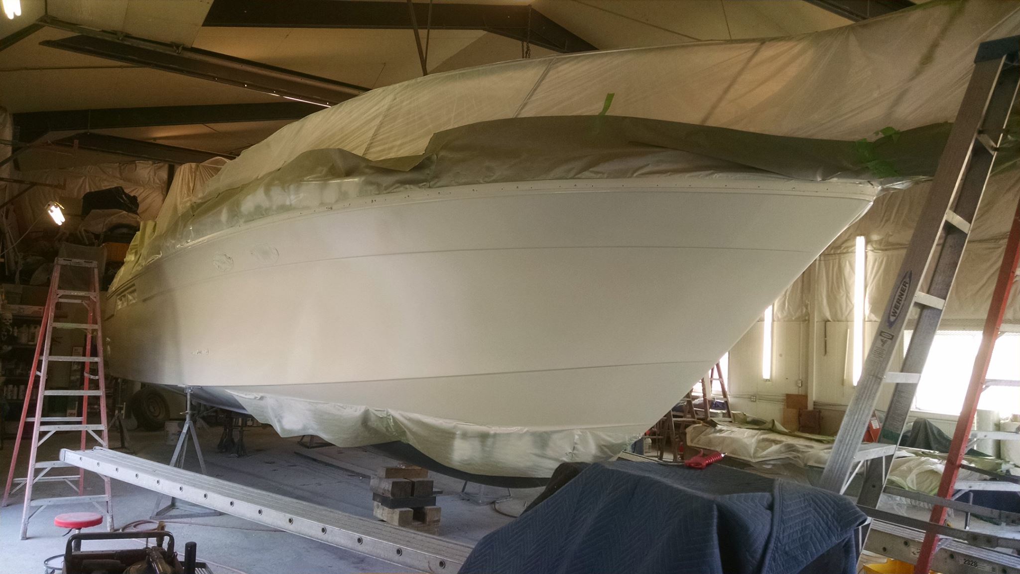 Heavy snow fall at Lake Chautauqua, New York, brought shed roof down on ski arch and windshield. Re-gel-coated top half, added new graphics. Replaced with new windshield and brackets.