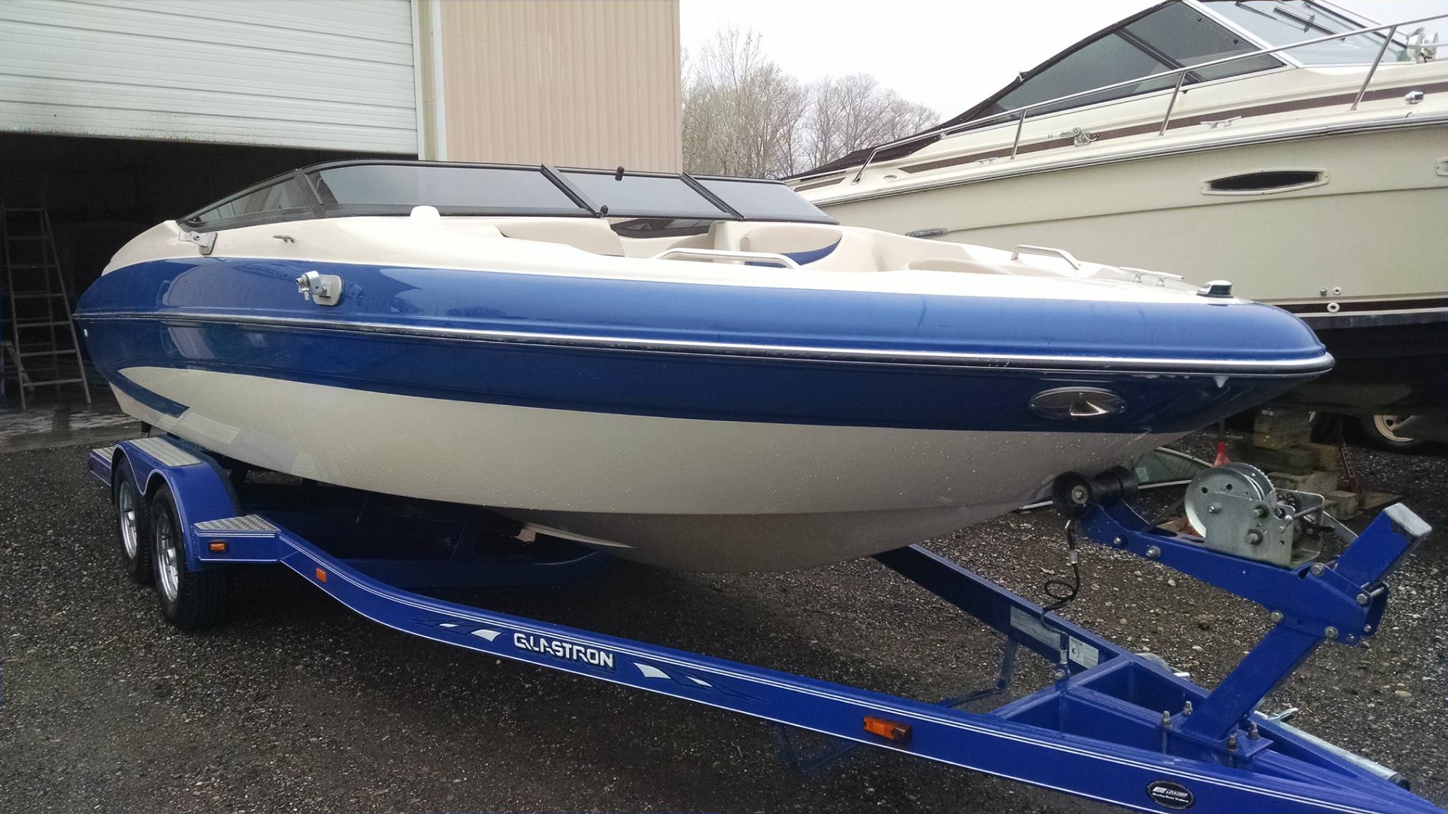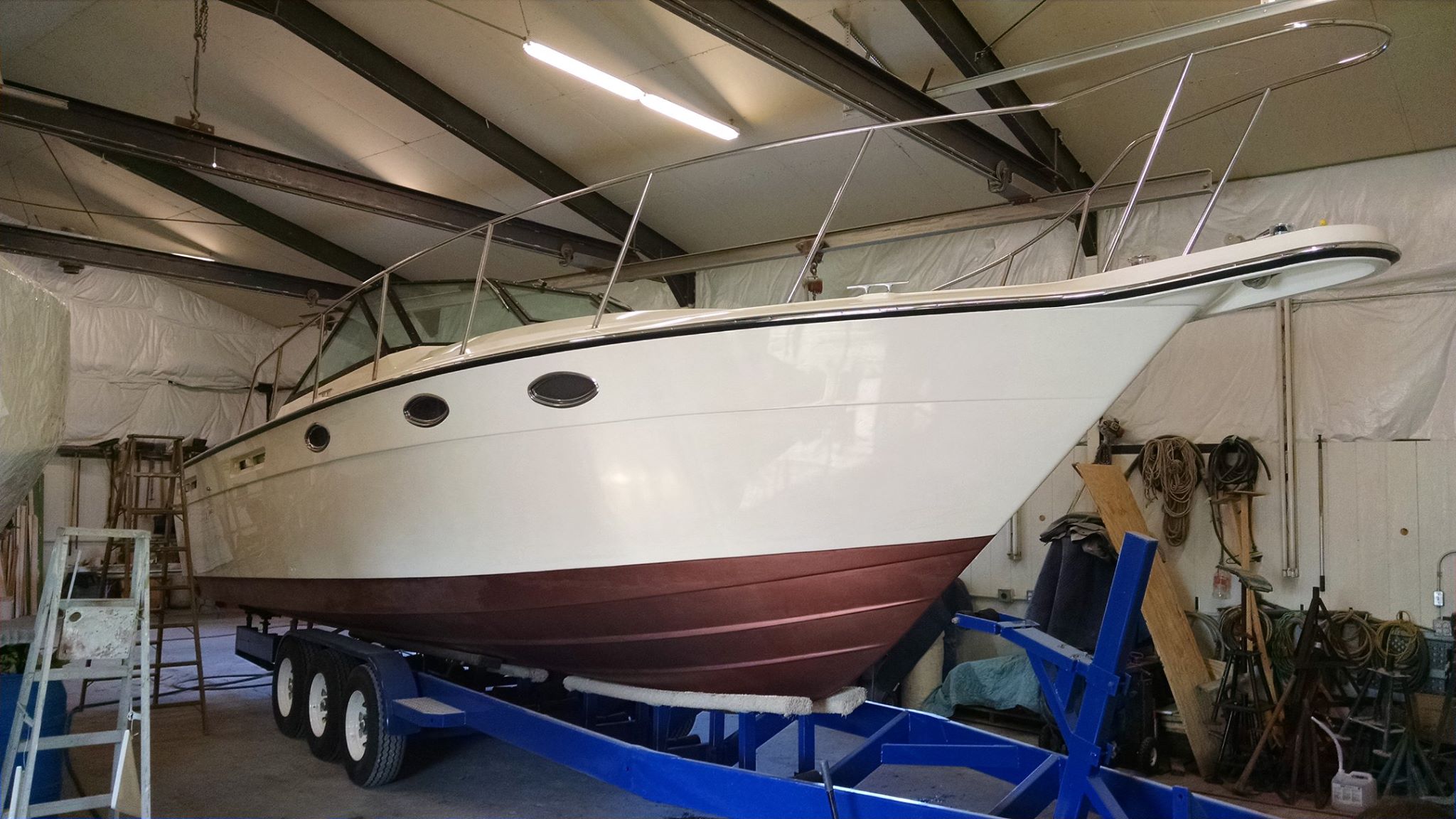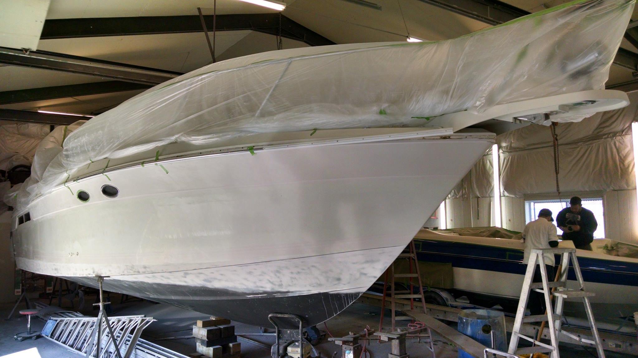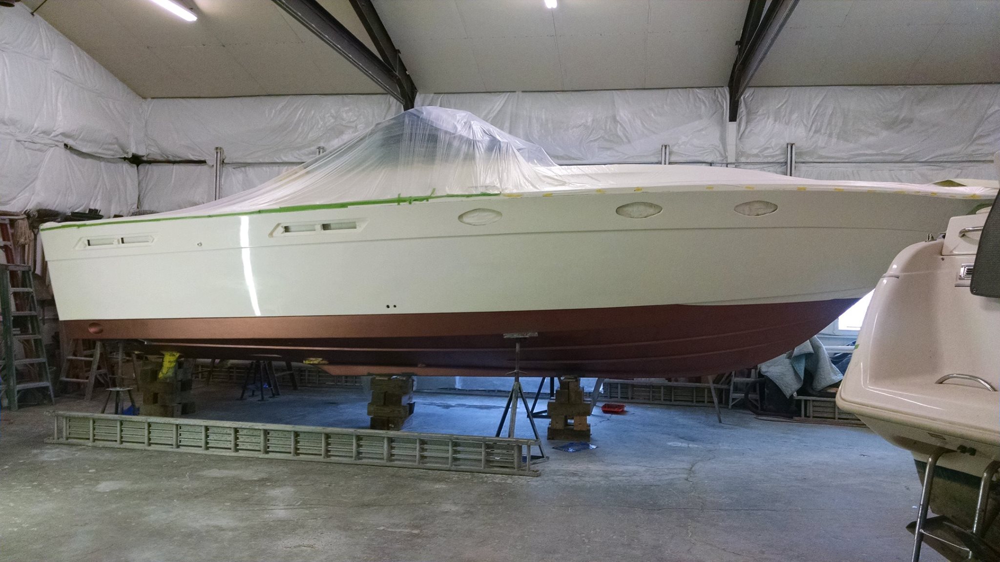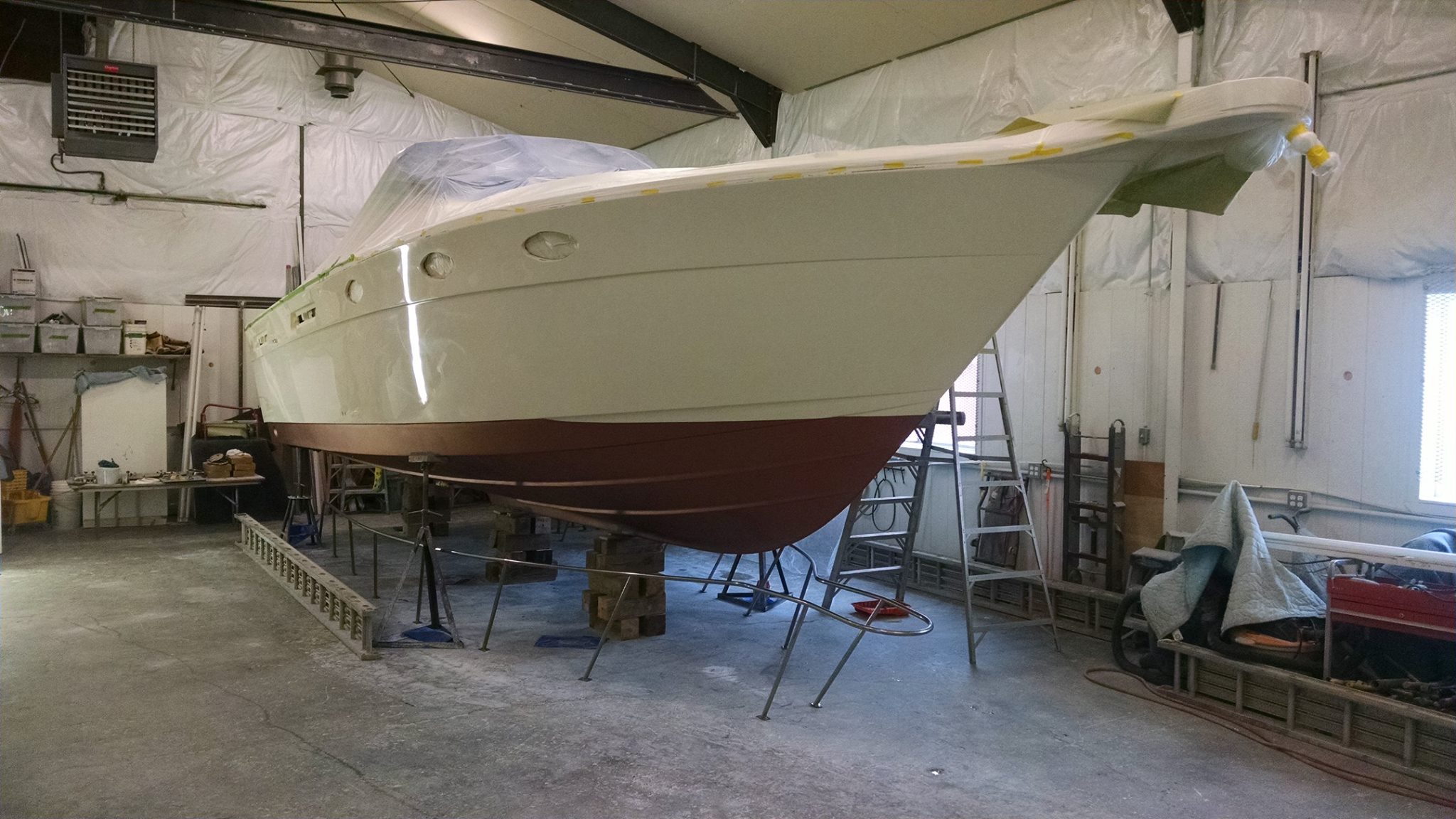 Heavy snow fall at Lake Chautauqua, New York, brought shed roof down on ski arch and windshield. Re-gel-coated top half, added new graphics. Replaced with new windshield and brackets.