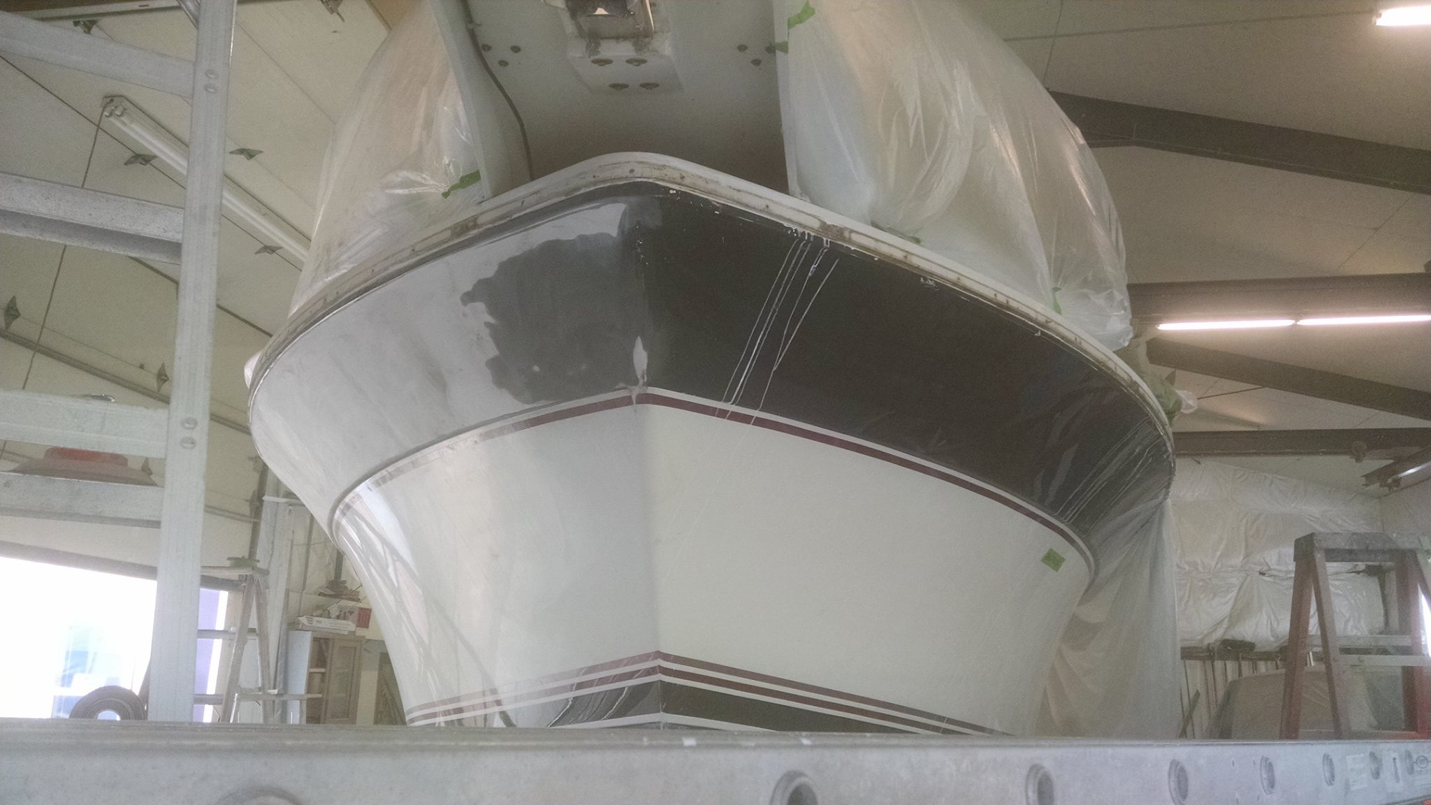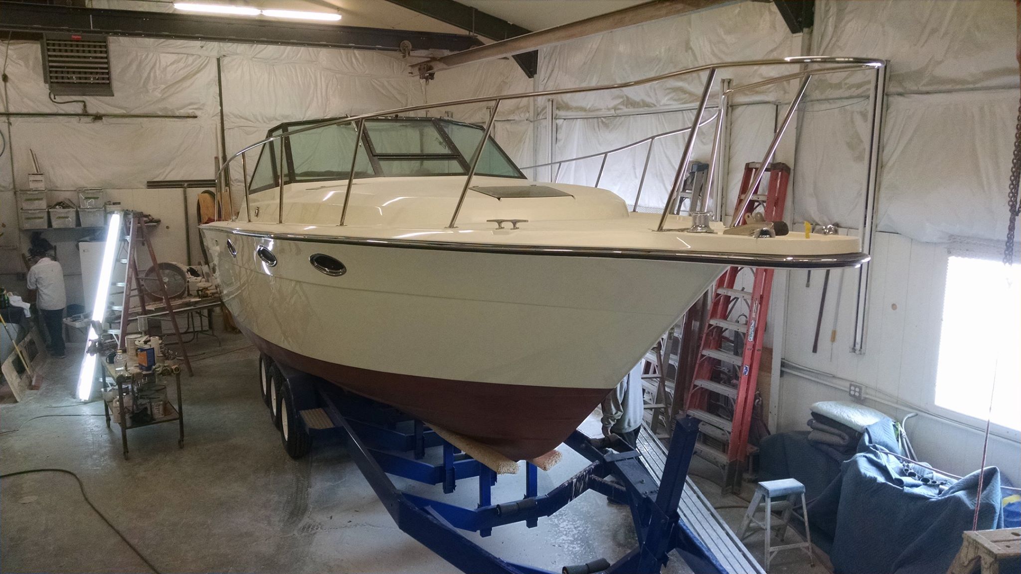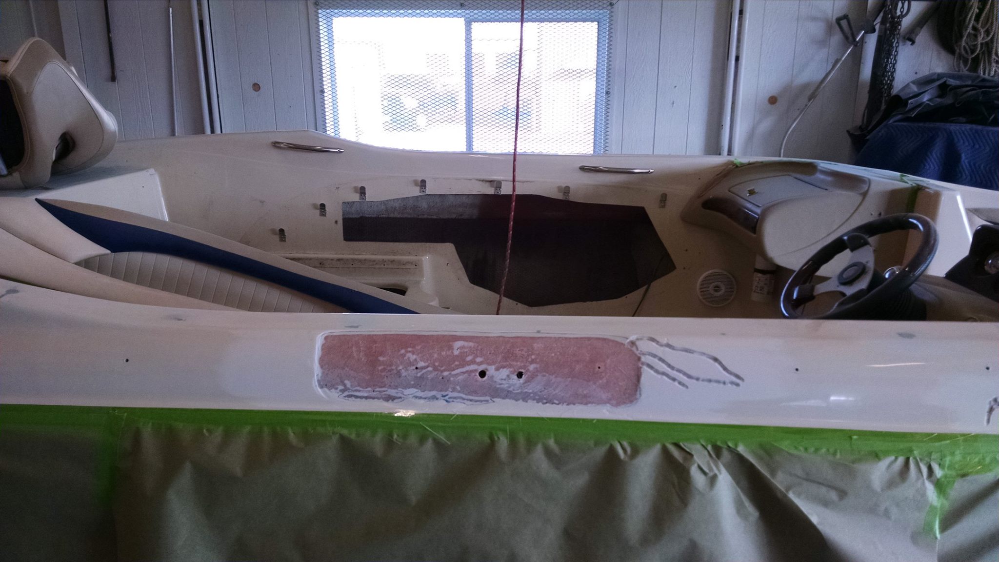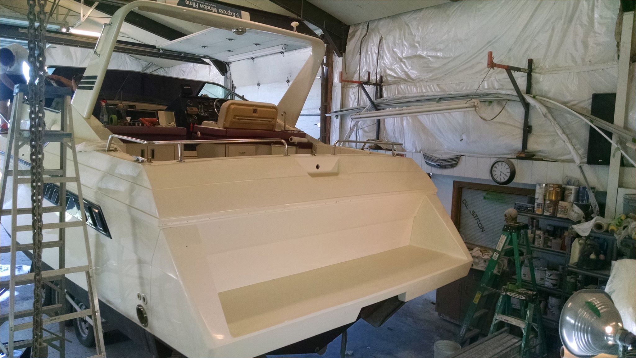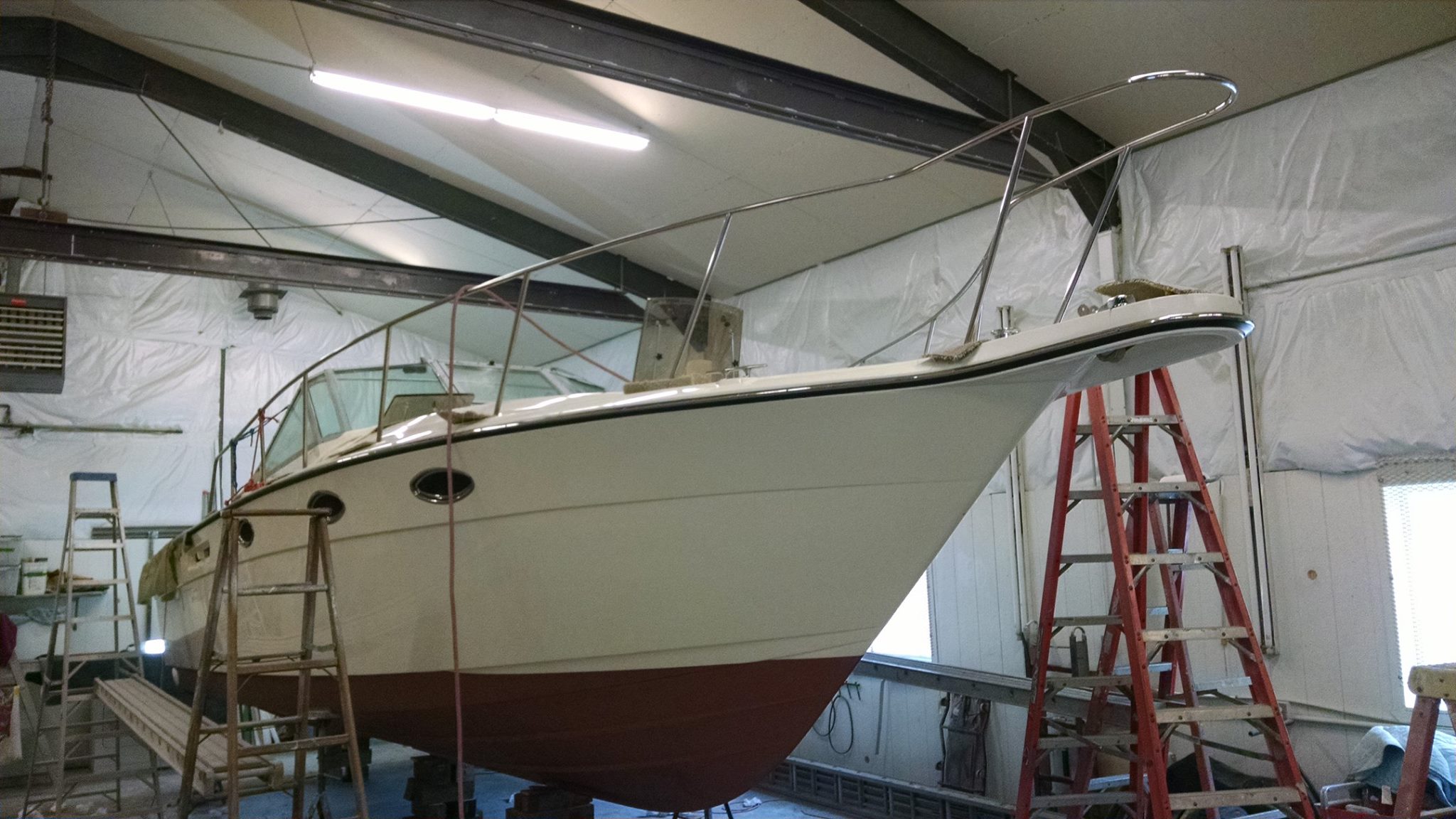 Heavy snow fall at Lake Chautauqua, New York, brought shed roof down on ski arch and windshield. Re-gel-coated top half, added new graphics. Replaced with new windshield and brackets.