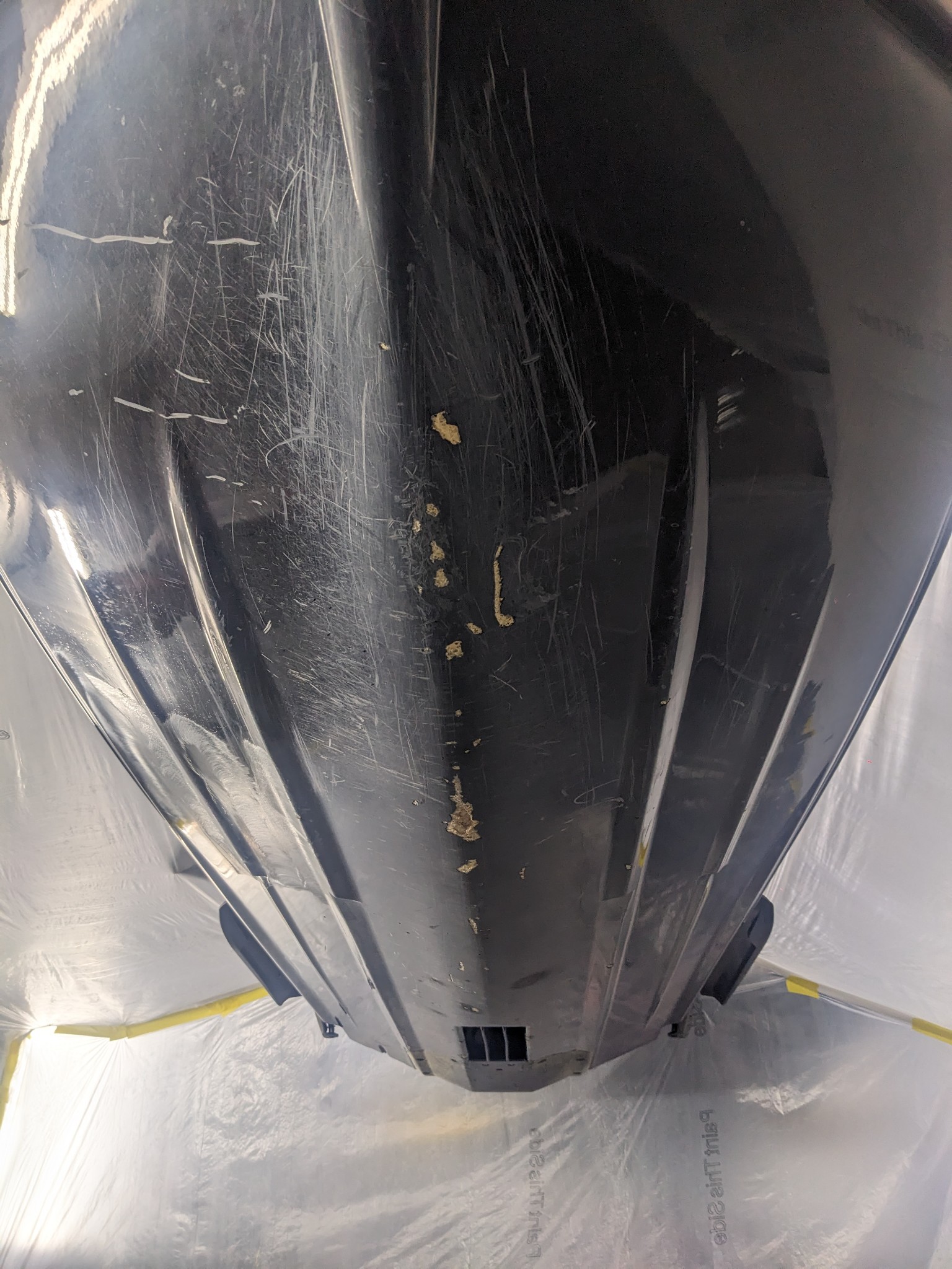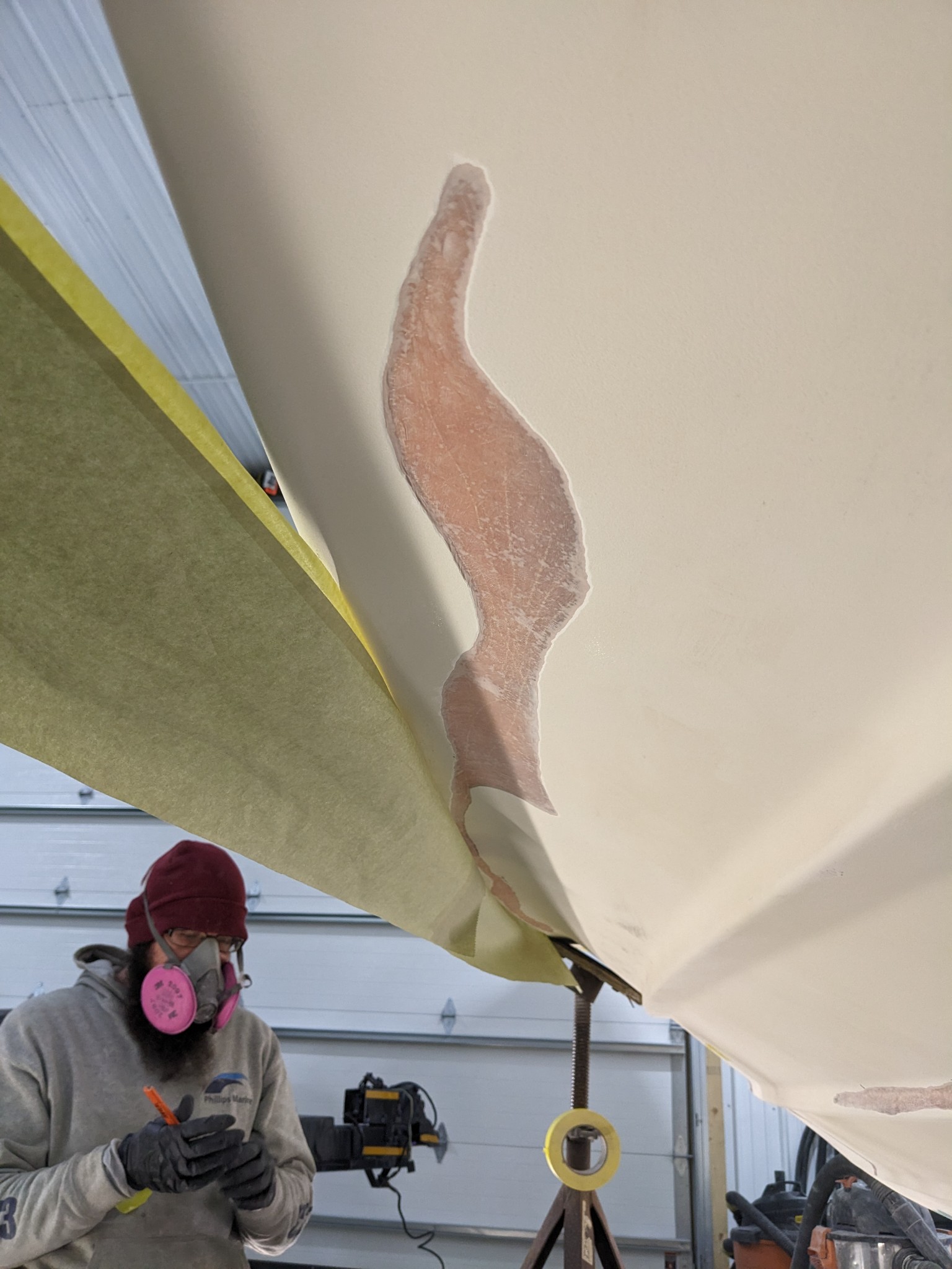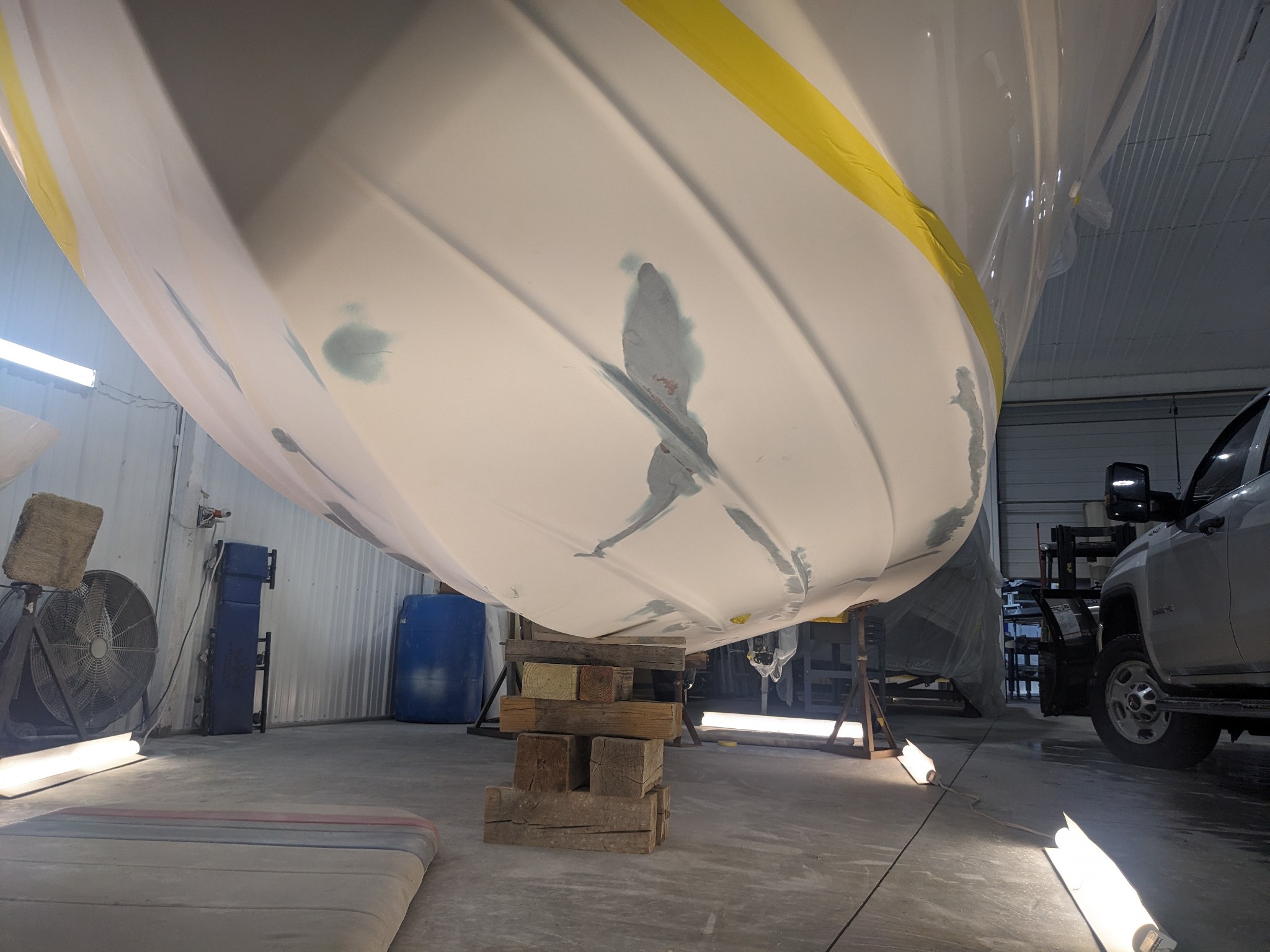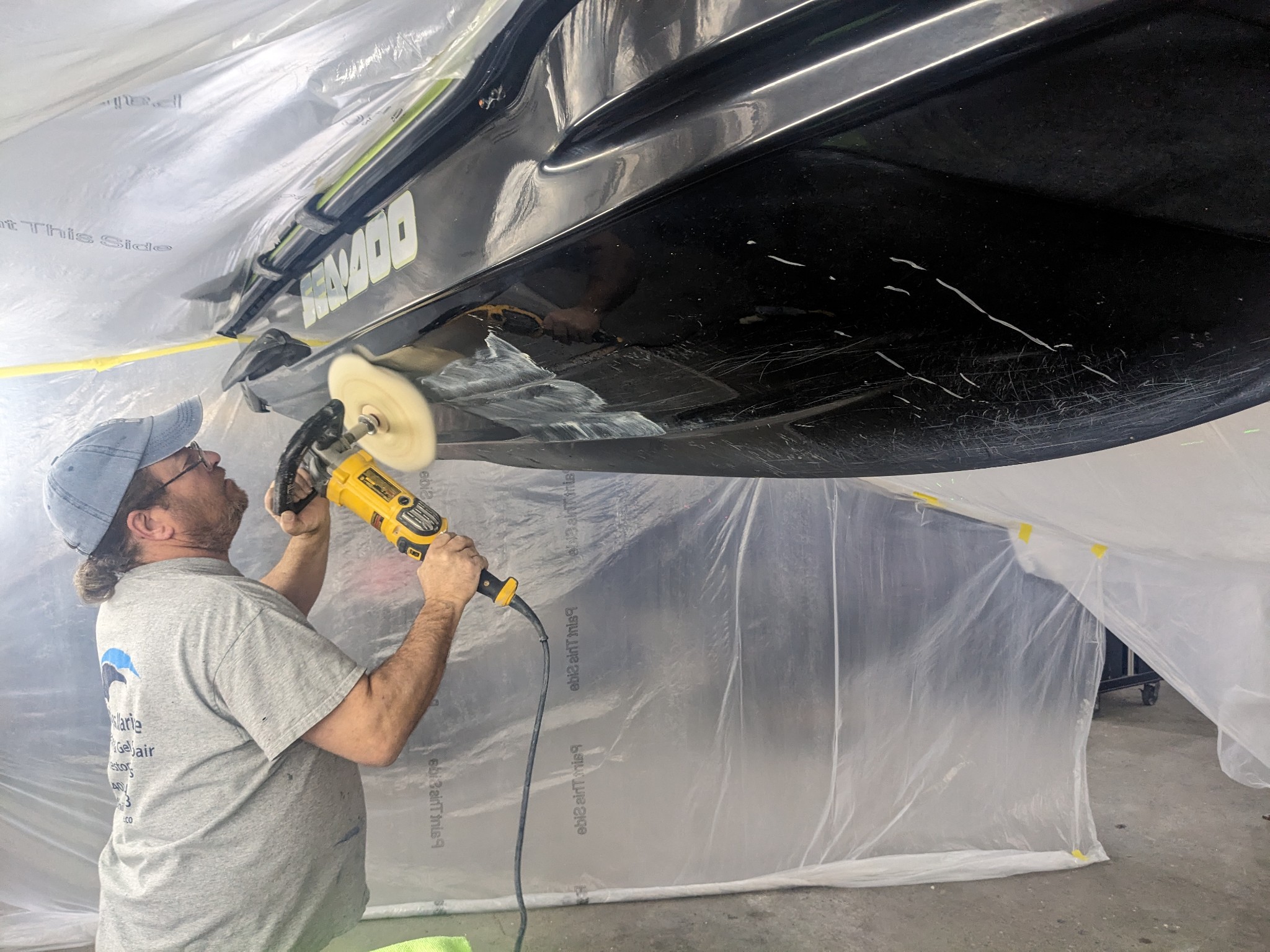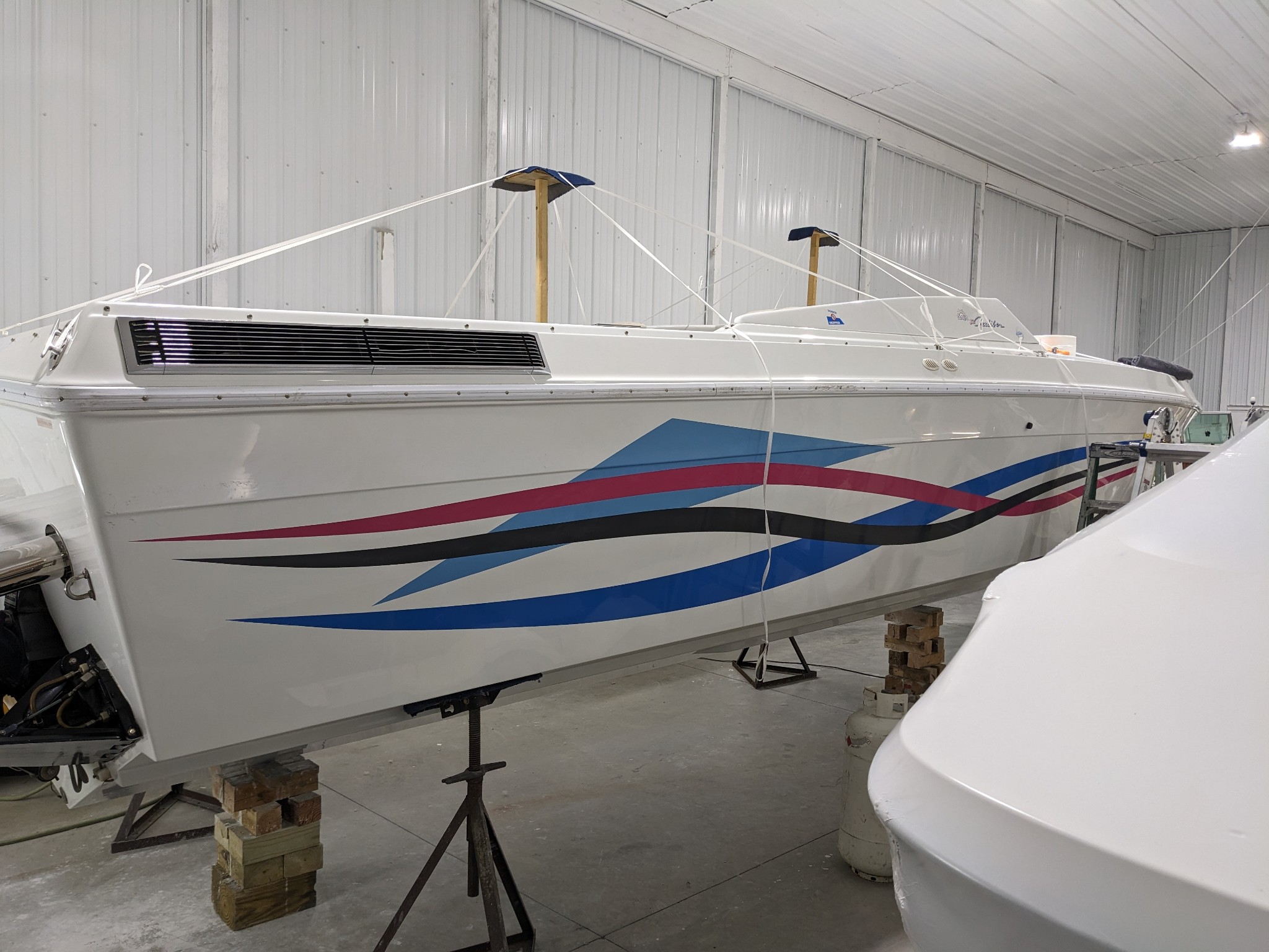Heavy snow fall at Lake Chautauqua, New York, brought shed roof down on ski arch and windshield. Re-gel-coated top half, added new graphics. Replaced with new windshield and brackets.